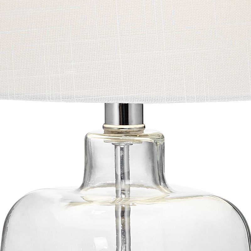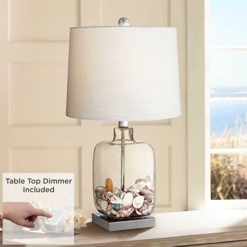 This fillable glass table lamp allows you to easily update your decor on a whim. The clear glass body can be filled with small keepsake items, collectibles, or other lightweight decorative pieces for a truly unique decor accent. A white drum shade up top lends itself to any collectible you put in the base, and it also creates a pleasing glow in the room. Easy on-off switch for operation. This lamp comes with a tabletop dimmer, which allows you to control the level of lighting. Simply insert the lamp plug into the dimmer outlet, and then slide the switch on the control to dim or brighten the lighting.