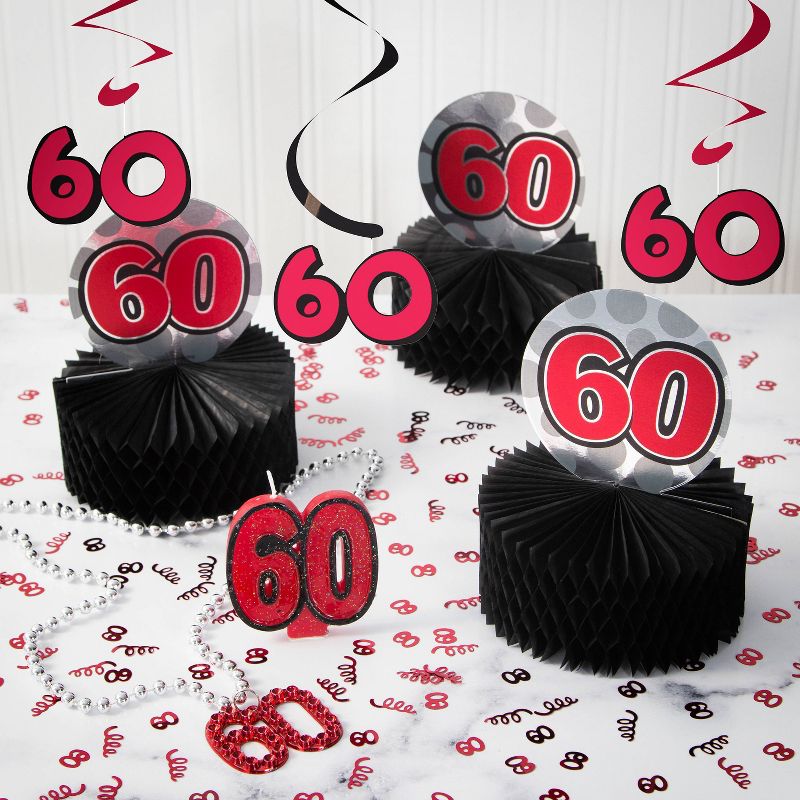 Make the party tables the center of attention with the 60th Birthday Centerpiece. This honeycomb centerpiece measures 6.25" x 5" and features a black base with a circular medallion cutout sitting atop with a vibrant "60" text in the center. Each table decoration comes in packages of 3 and is ideal for your next 60th birthday party.