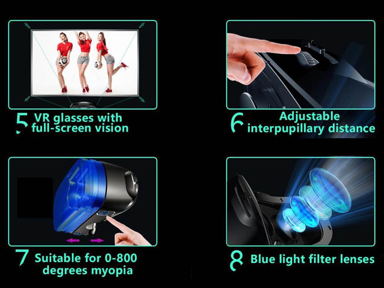 4. High Transmittance Optical Lens: The blue-coated lenses can effectively prevent the influence of blue light, stray light and aura, thus ensuring a clearer 120° wide-angle field of view and better immersion.