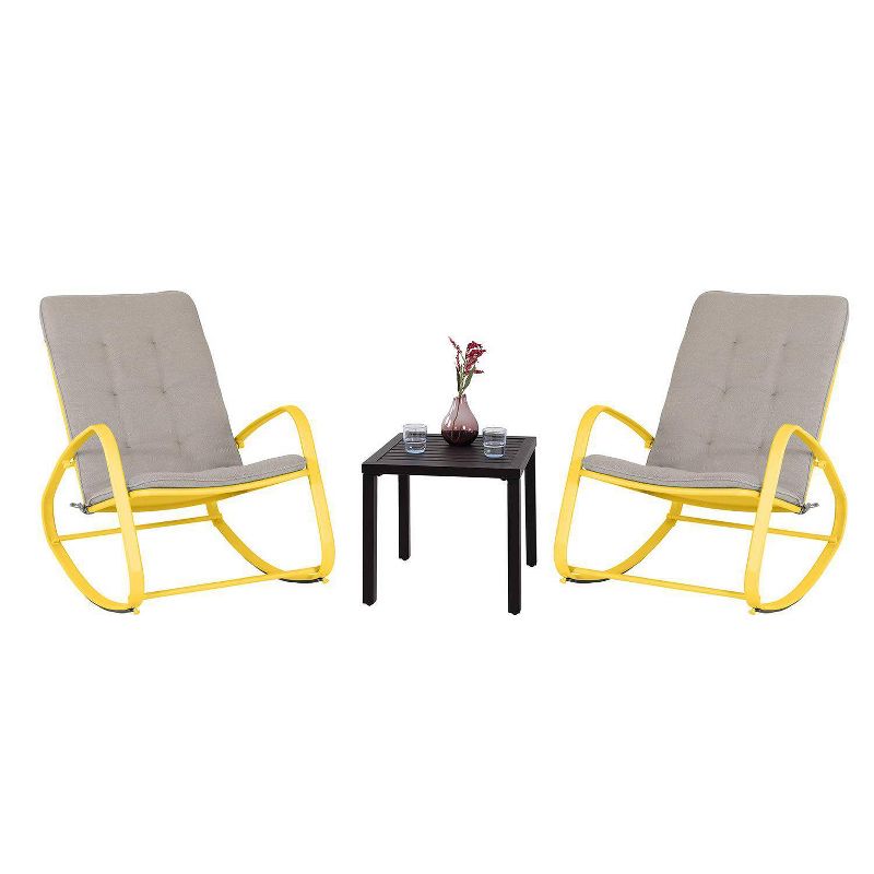 •Ergonomic Rockers: Combining comfort with tradition these classic color of macaron powder-coated, which can bring you a relaxing home feeling. Rust-resistant steel rockers have color-fast all-weather poly-fiber warm gray cushions that will last for years in harsh weather extremes. The set comes with a matching metal side table