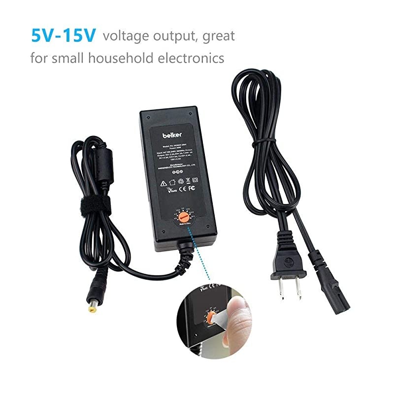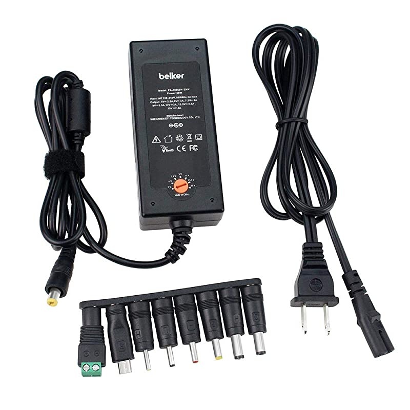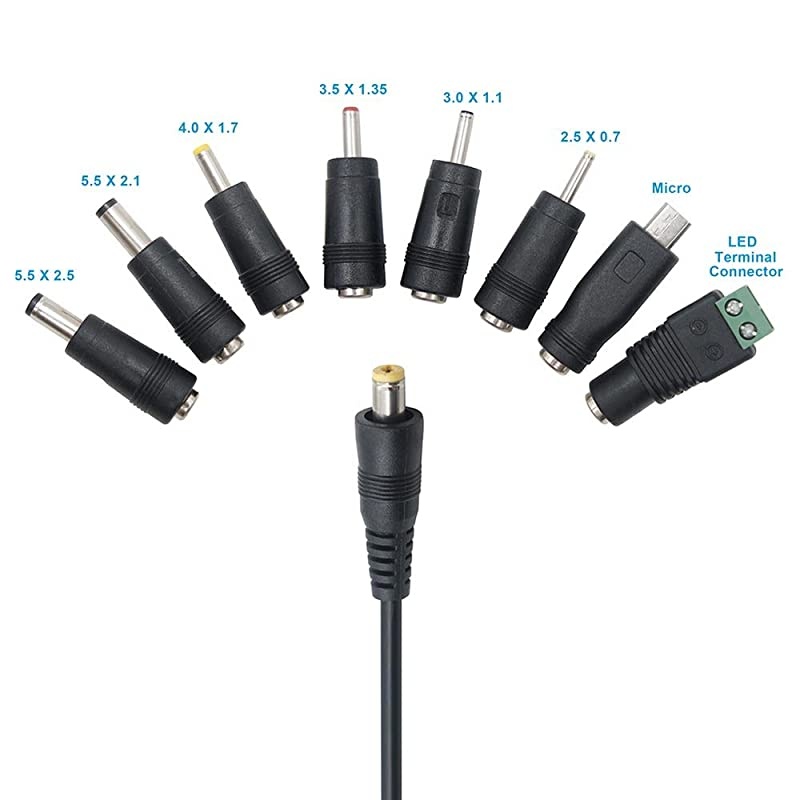 Output: 5V 6V 7.5V 9V 12V 13.5V 15V 3000 mAh. Max. 45W 8 Adapter DC Plugs • 5.5 * 2.5 mm • 5.5 * 2.1 mm • 4.0 * 1.7 mm • 3.5 * 1.35 mm • 3.0 * 1.1 mm • 2.5 * 0.7 mm • Micro USB-B plug • LED terminal connector Work with Most polular AC/DC products, Smart Phone, Tablet, wireless receivers, printers, game consoles, Security Product, Routers, Digital Product, printers, LED Strip Lights, Echo, Echo Plus, Echo Show and 2nd Generation Fire TV, electronic gizmos, replacing charger cords, rowing machine, GPS, USB Charging Camera, Speakers, 5V to 15V Small Home Electronics, etc.. IMPORTANT NOTE • Please do not use on devices over 45W • Please do not use on constant voltage devices. How to Check Your Device Required Voltage and Power Usually, your device required voltage will be printed beside the power port or beside the battery Slot. Your device required Power watt is the value of required voltage multiplies required amps. For example, if your device asked input voltage 15v 2a, then the required power is 30W.