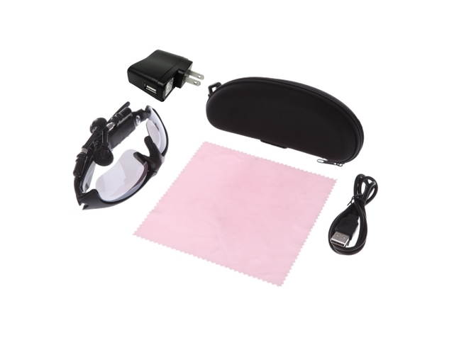 Package weight: Approx. 192g / 6.8 oz Packing List 1 * MP3 & Bluetooth Sunglasses 1 * Power Plug 1 * Cleaning Cloth 1 * USB Charge Cable 1 * Case 1 * user Manual (English)