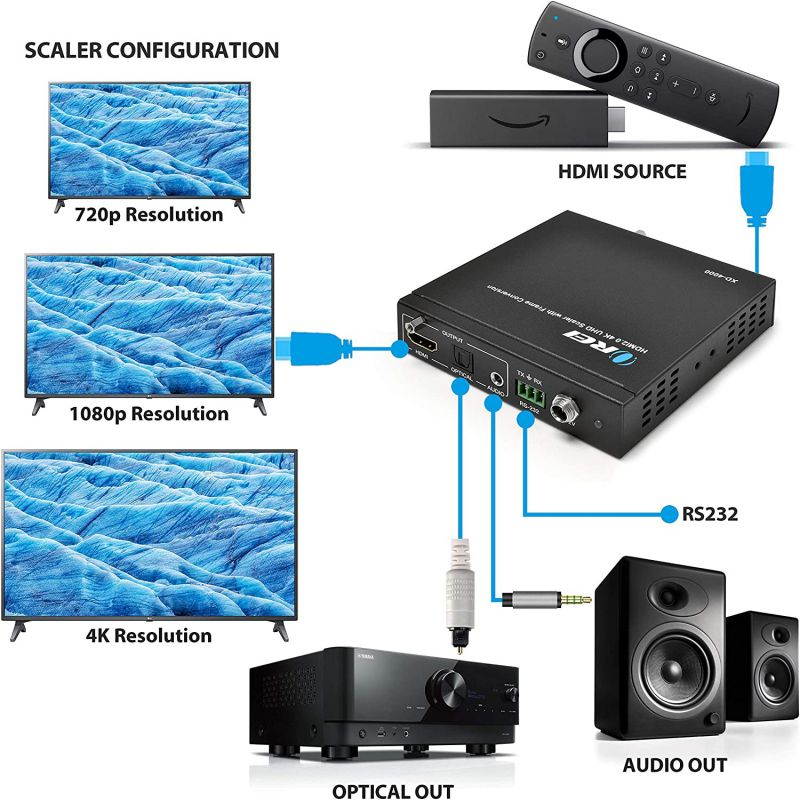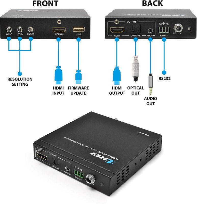 Features Orei XD-2400 is an advanced HDMI to HDMI Scalar Box. It accepts HDMI input with a separate analog audio ( 3.5MM ) and scale it to HDMI output (a number of selectable resolutions and frequencies (PAL/NTSC) ) with additional digital audio (optical) and analog audio ( 3.5MM ) output. It provides one HDMI input and one HDMI output and automatically scales any input signal to match the native resolution of the display, or any connected HDMI device. The output can also be manually set to a specific resolution if desired.