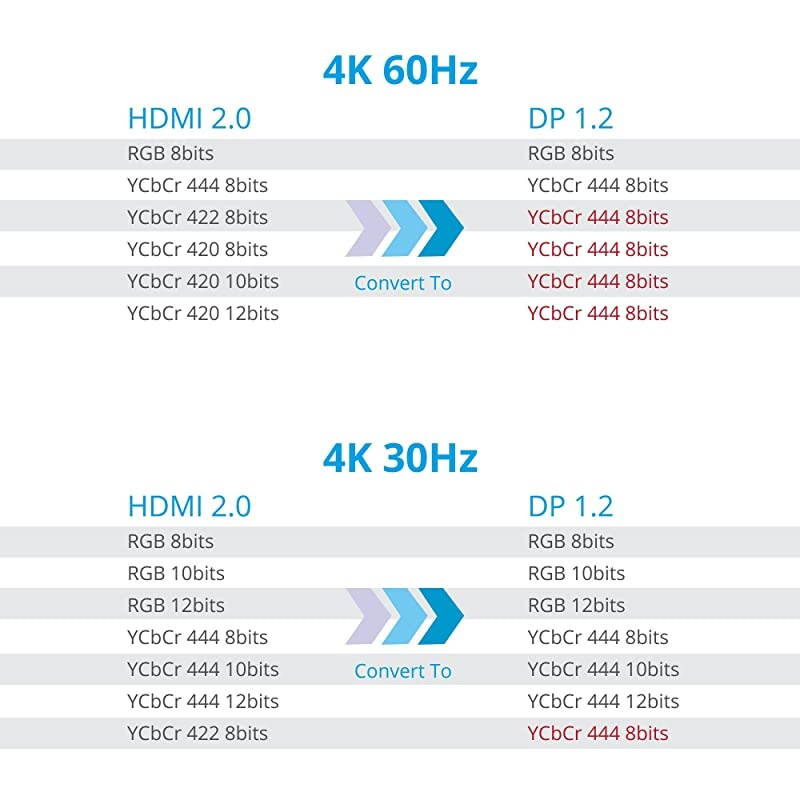 **NOTE: This is not a bi-directional converter. DO NOT use for DisplayPort HDMI conversion. Supports up to 4K @60Hz 4:4: 4 (8-bit). Compliant with HDMI 2.0 a, DisplayPort 1.2 a, and HDCP 2.2 / 1.4. Supports 8-bit, 10-bit, 12-bit Deep Color.