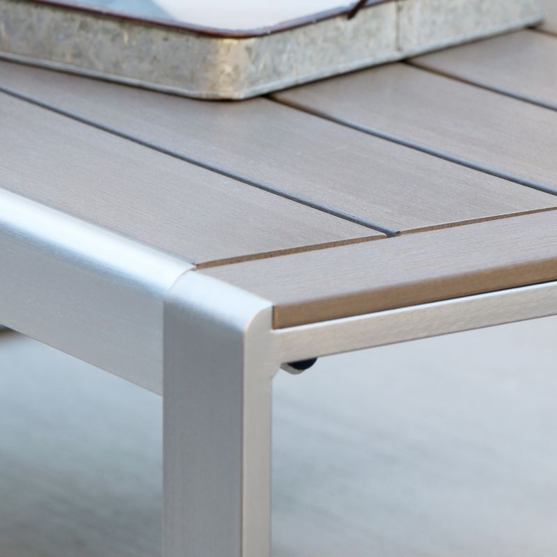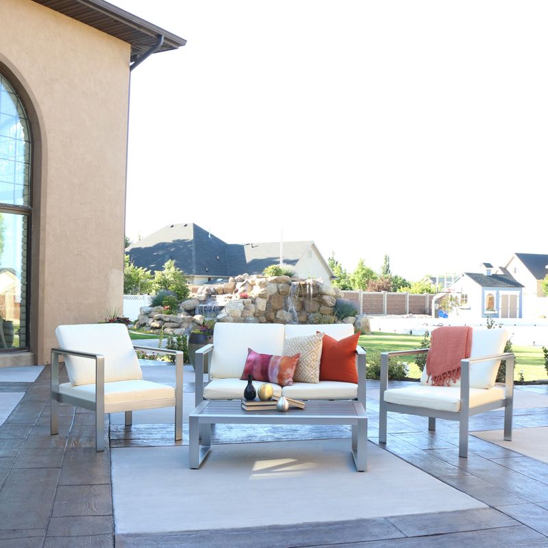 Make your outdoor space more inviting with this Modern Style 4 Piece Chat Set. Featuring a powder-coated aluminum frame with poly-synthetic wood accents for a durable design, this set is sure to be a long-lasting addition to any patio, deck, or outdoor setting. Plush, polyester cushions and neutral color tones make this cozy chat set an easy fit in your outdoor area.