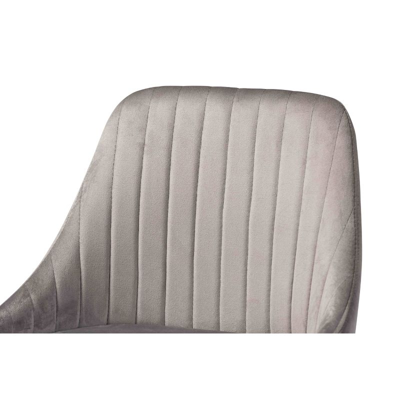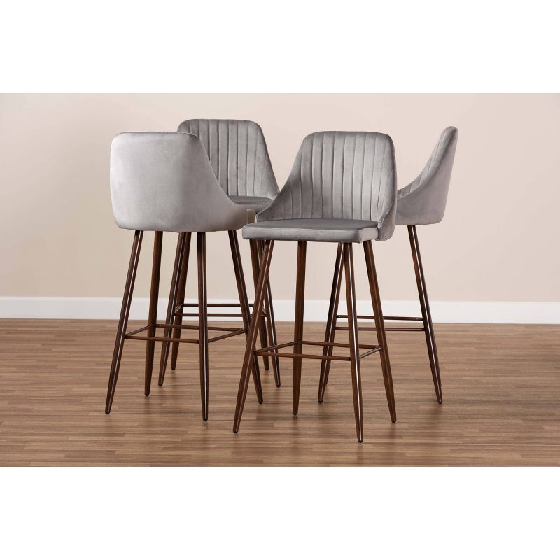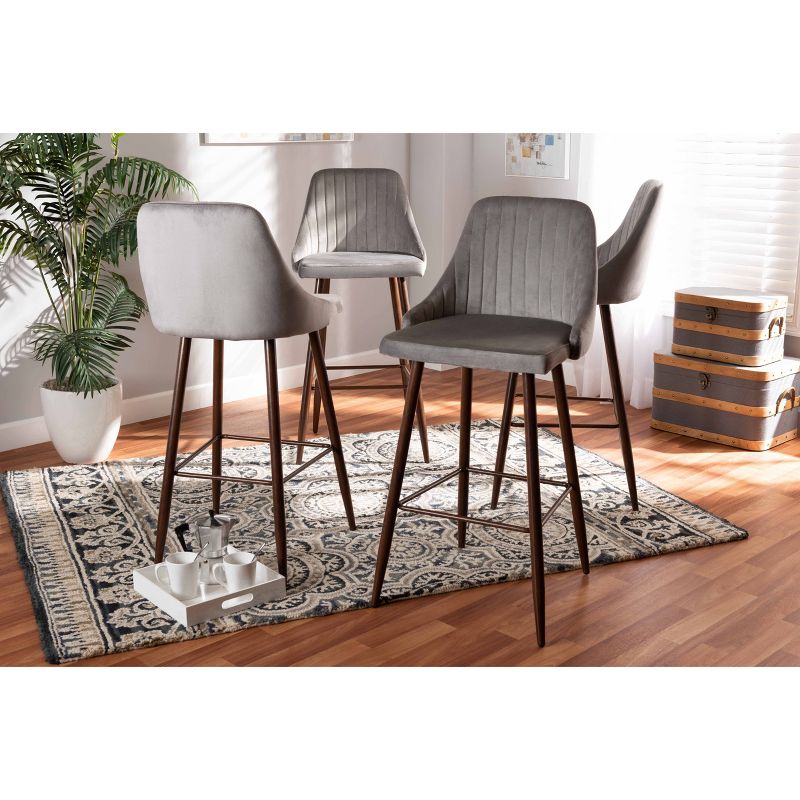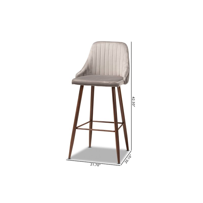 Easily add character to any home bar or lounge area with the unique Walter bar stool. Made in China, the Walter is composed of a metal frame overlaid with a chic walnut wood grain finish and fitted with a sleek velvet fabric upholstered seat. Stylish channel tufting adds a contemporary look, while foam padding ensures plush comfort. Requiring assembly, the Walter features ergonomic footrests on three sides. A visually stunning design equipped with excellent comfort makes the Walter bar stool an easy upgrade for any dining space.