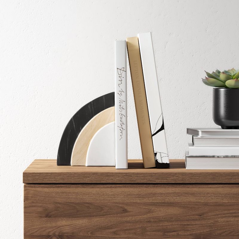 Simply elegant, this 5-Inch Marble and Wood Bookend from Project 62™adds a decorative touch to your space. Designed to look like a half rainbow, this decorative bookend boasts a marble and wood construction in a combination of white, beige and black for a soft touch of color that goes well with your existing decor. Use this five-inch bookend to keep books organized in your living area or home office.