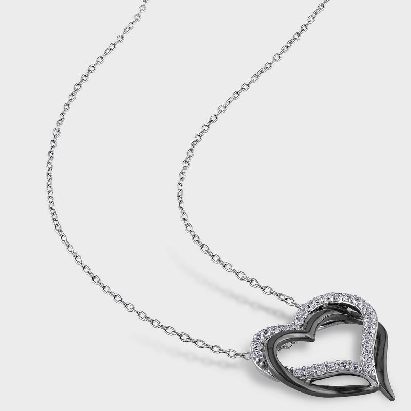 For a piece that shows your love — whether for someone else or as a gift of self-love — the 5/8 CT. T.W. White Diamond Heart-Shaped Pendant in Sterling and Black Rhodium-Plated Silver makes a great pick. This heart pendant necklace features two overlapping heart pendants, one made from black rhodium for a dark, sleek look that perfectly complements the sparkle of the other heart's manufactured diamonds. The pendants dangle from an 18-inch chain that's a great length to stand out with a variety of neckline style, working just as well layered over a turtleneck as adding some elegance to a scoop neck tee. A spring ring clasp ensures this diamond heart necklace stays secure around your neck.