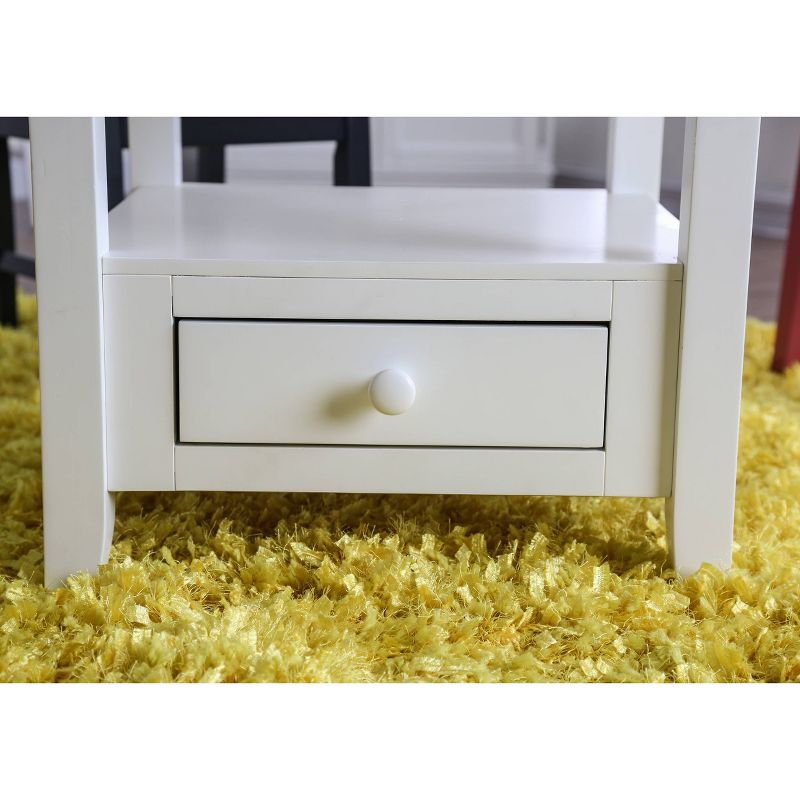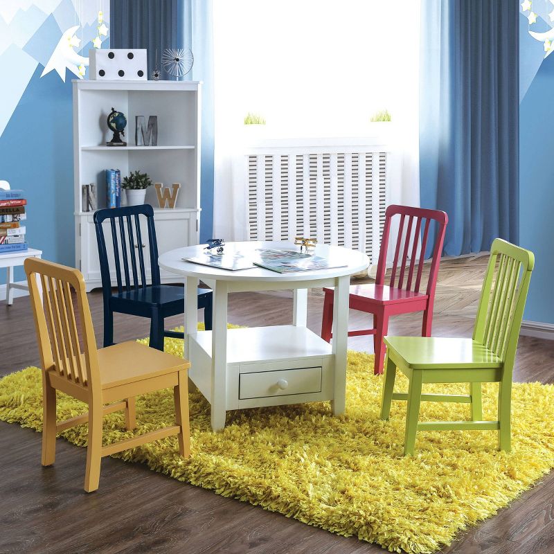 The world of color awaits in a child's bedroom or play space with this fresh, inspiring set. The 5pc Holly Contemporary Round Kids Table Set is the perfect place for creativity and play. This kid size white table offers a stacked rounded top with a bottom drawer for stashing art supplies. Four vibrantly colored slat back chairs invoke a stylish traditional schoolhouse look with modern flavor. Make this set a staple in a play room or bedroom.
