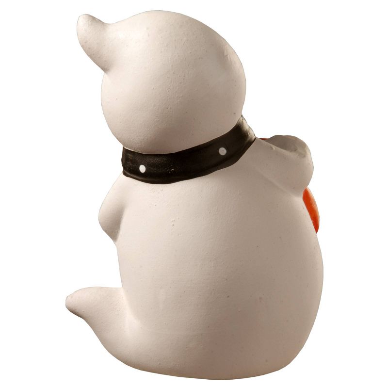 This Halloween decoration features a smiling bow tie wearing ghost holding pumpkins that spell BOO. Color-changing battery operated LED lights (repeating red/blue/green) shine from inside the piece through the cutouts. It is constructed of strong poly resin material for long lasting enjoyment.