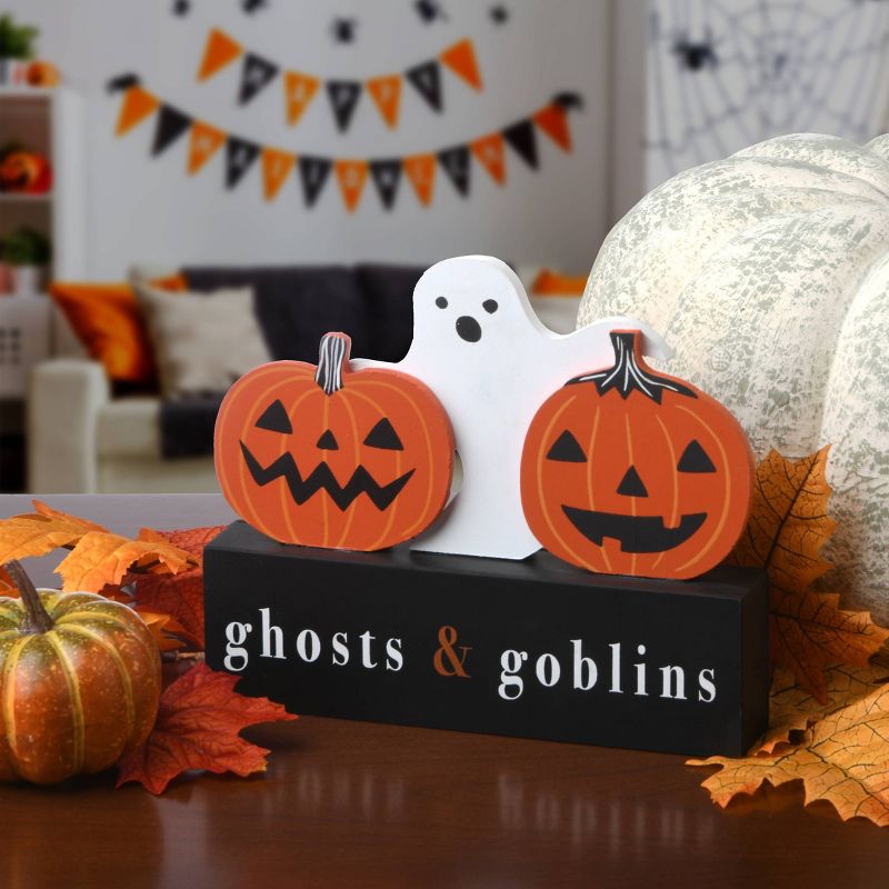 Show visitors that Halloween has arrived with this timely tabletop decoration. This rectangular sign features a howling white ghost flanked by two bright orange face-carved jack-o-lanterns. “ghosts and goblins" is the scary sentiment printer across the front. Constructed of lightweight wood composite material, this spooky sign will add a fun element to your Halloween decorating scheme.
