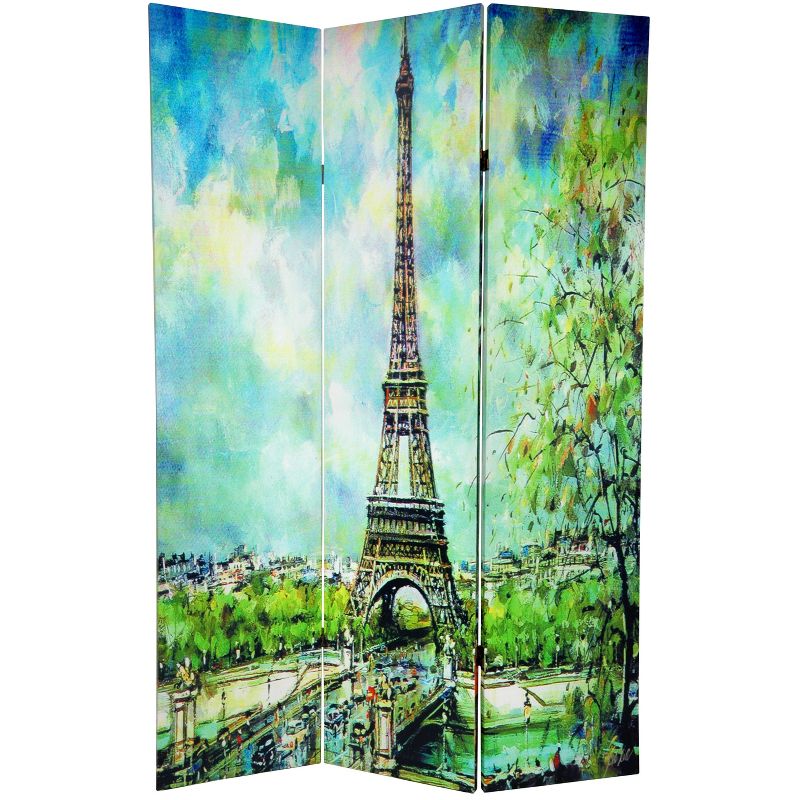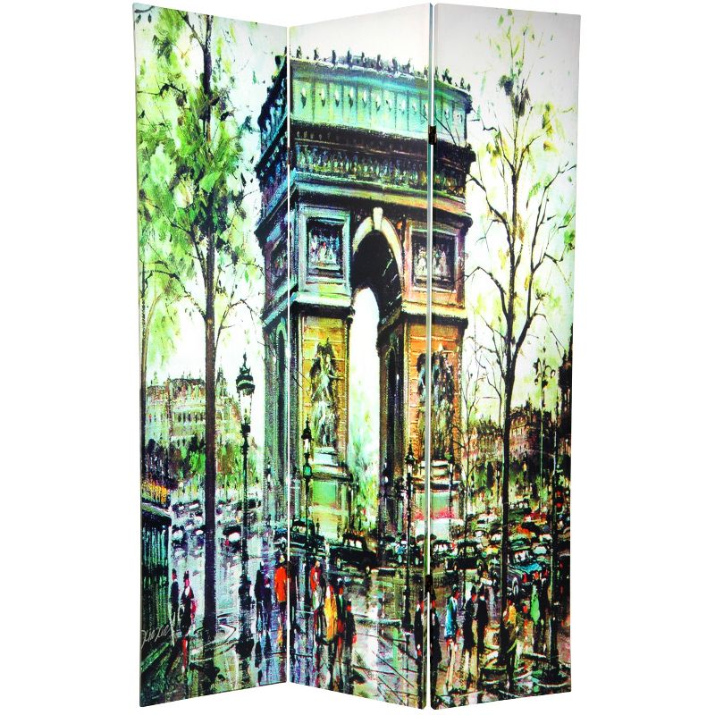 Feel like you're roaming the streets of the city of love when you add the Double-Sided Paris Room Divider from Oriental Furniture to your space. with the Arc de Triomphe on one side and the Eiffel Tower on the other, this room screen creates a charming finishing touch to any room. with two distinct decorative accents on either side, this three-panel room divider can be displayed with either side front and center, and flipped to change the look of your space.