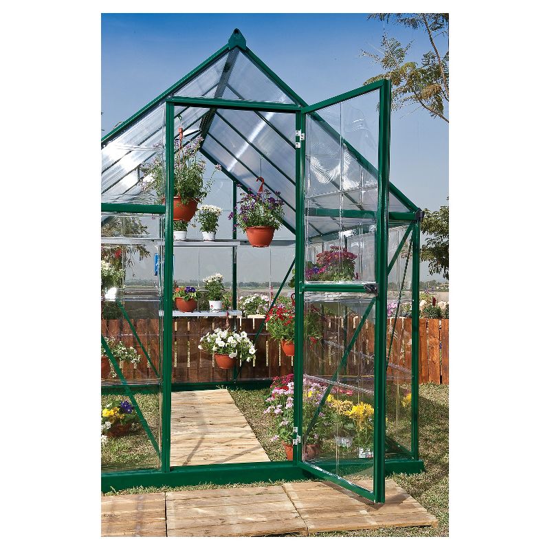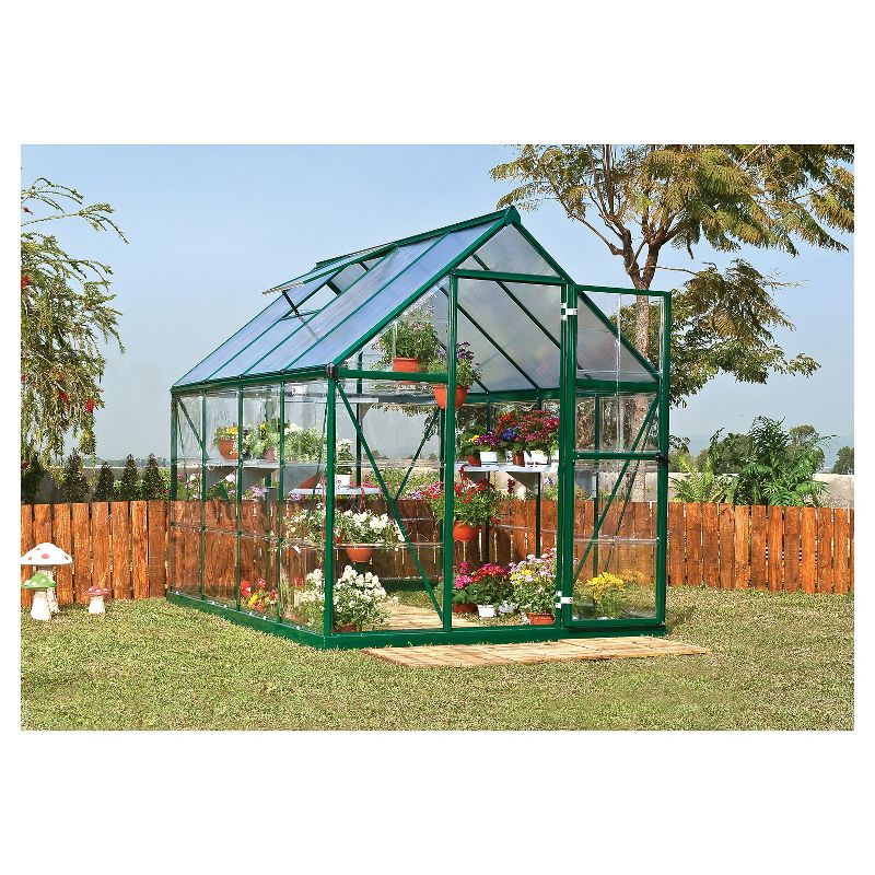 The Hybrid 6' x 8' Greenhouse from Palram combines two types of polycarbonate panels to create a balanced environment for your plants. The translucent polycarbonate roof panels have twice the heat retention of single layer panels and allow the light to reach your plants at all angles while the crystal-clear polycarbonate side panels provide over 90% light transmission and block harmful UV rays.
