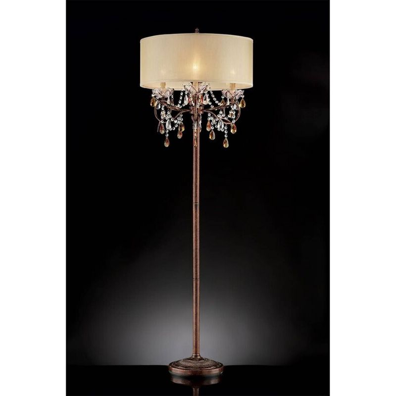 Update your home with the sophisticated elegance of this three-light reddish bronze candelabra. The Magnolia Crystal Floor lamp has artistic curves that glisten from clear and amber crystal accents and pendulous. This Crystal Bronze Candelabra Floor Lamp comes with a scroll detailed frame, amber and clear crystal accents and a natural beige drum shade. This floor lamp simply bursts with excitement and glamour. Victorian Core column is accented by a tree branch motif with crystal droplets. Candelabra Lights rest on crystal saucers with crystal bead ending with a tear drop pendants. Display this floor lamp with confidence and will surely complements your decor and makes it a conversationalist item. Light bronze beige linen with black texture stripe down drum shade measures 22 in. L x 22 in. W x 9 in. H. Comes with a Victorian column body measures 4 in. Dia x 12.5 in. H. Detailed Victorian scroll finial measures 2 in. W x 3 in. H. Floor body measures 67.25 in. H. Clear crystal glass with purple paint saucer measures 4.75 in. Dia x 2 in. H.