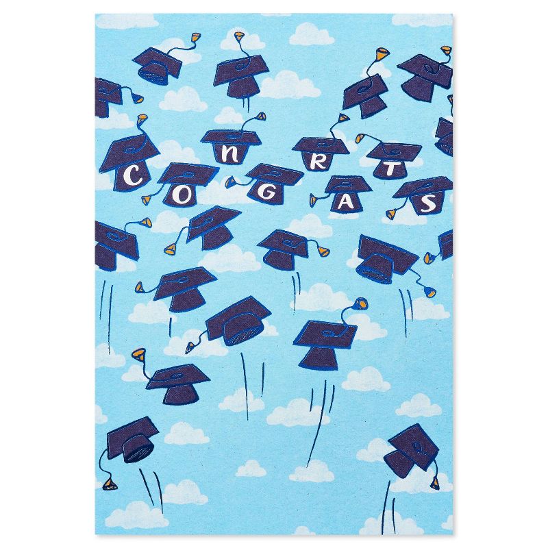 Congratulate the special graduates in your life with a cap-tossing Graduation card from American Greetings! This 6-count greeting card package features a modern graphic design of graduation caps flying in a bright blue sky, with “Congrats” spelled out in a fun lettering design. Blue gloss accents embellish the design, with full color continuing inside the card. The warm and happy inside message celebrates any graduate and motivates them to new heights! When it's time to celebrate, you’ll be glad to have the perfect graduation cards at your fingertips!