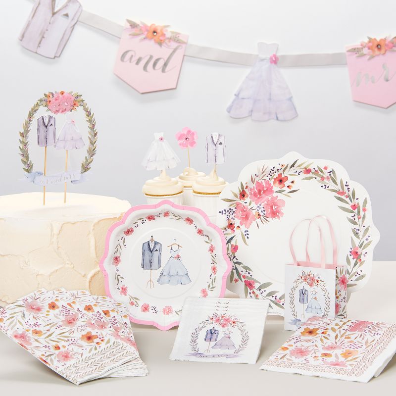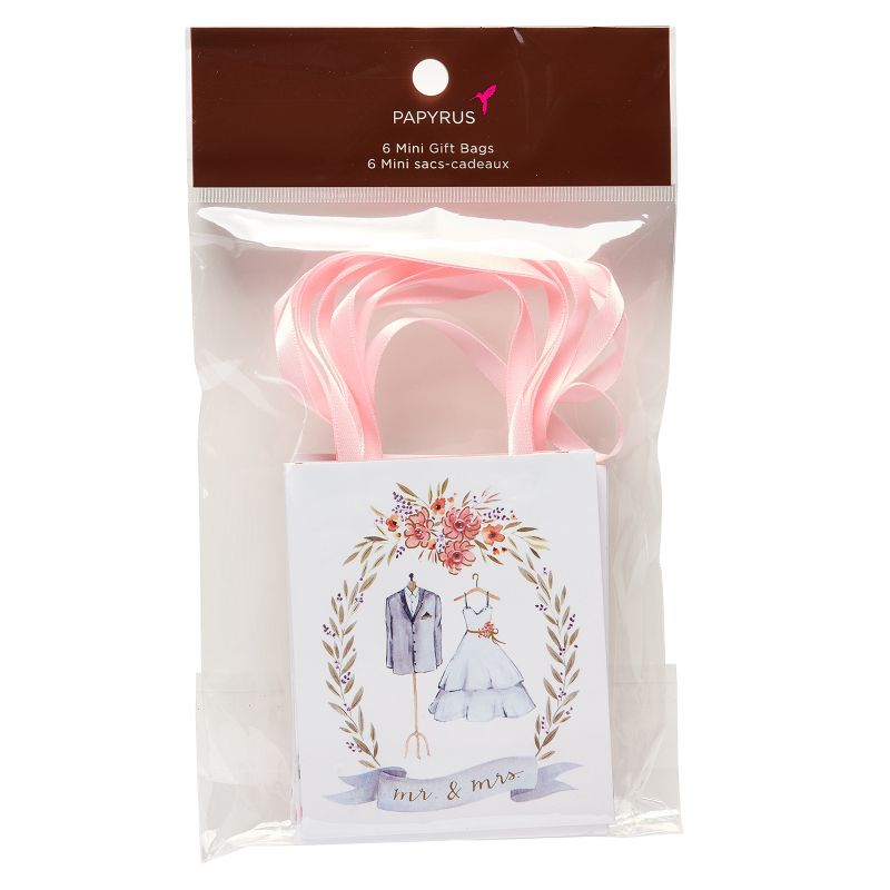 Celebrate the Mr. & Mrs. with these lovely treat bags from Papyrus that's perfect for wedding celebrations or bridal showers. The bride and groom's gown and jacket surrounded by a garland and banner add a touch of sophisticated whimsy to this unique design. Finished with gems, gold foil and satin ribbon handles. Coordinates with the Happily Ever After collection.