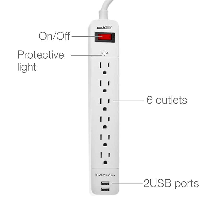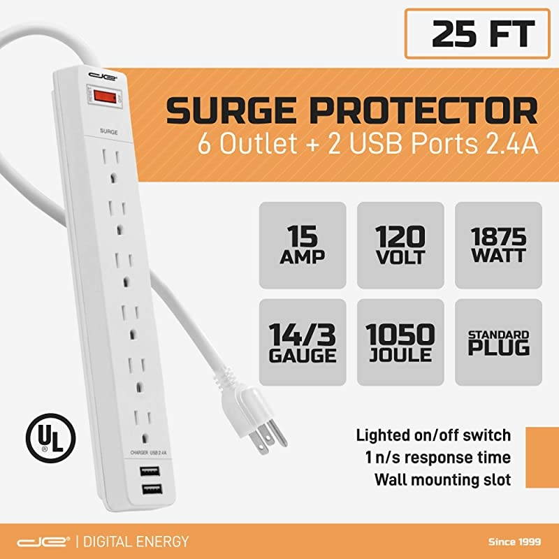 **********25 Foot, 6 outlet surge protector power strip with lighted On/Off switch. 2 USB Ports with 2.4A of power. Surge protector rated for 15 AMP / 120V / 60 Hz / 1875 Watts / 1ns response time. 14/3 Gauge Wire. Two keyhole style mounting holes in the back. UL Listed and conforms to ETL standards. *****1050 Joules of