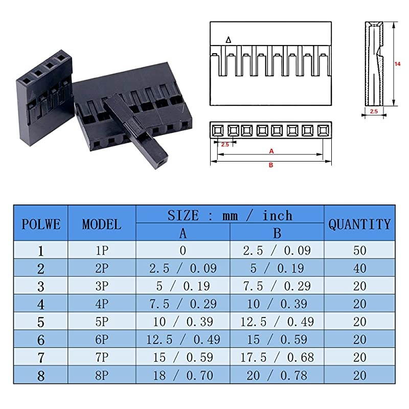 Package Details: (All Products Spacing 2.54 mm) ----- 1x1P Connector Housing Female x 50Pcs ----- 1x2P Connector Housing Female x 40Pcs ----- 1x3P Connector Housing Female x 20Pcs ----- 1x4P Connector Housing Female x 20Pcs ----- 1x5P Connector Housing Female x 20Pcs ----- 1x6P Connector Housing Female x 20Pcs ----- 1x7P Connector Housing Female x 20Pcs ----- 1x8P Connector Housing Female x 20Pcs ----- 2x2P Connector Housing Female x 10Pcs ----- 2x3P Connector Housing Female x 10Pcs ----- 2x4P Connector Housing Female x 10Pcs ----- 2x5P Connector Housing Female x 10Pcs ----- 2x6P Connector Housing Female x 10Pcs ----- 2x7P Connector Housing Female x 10Pcs ----- 2x8P Connector Housing Female x 10Pcs ----- Wire Cable Female Pin Connector x 210Pcs ----- Wire Cable Male Pin Connector x 210Pcs ----- 5-Feet 10-Wire Rainbow Color Flat Ribbon IDC