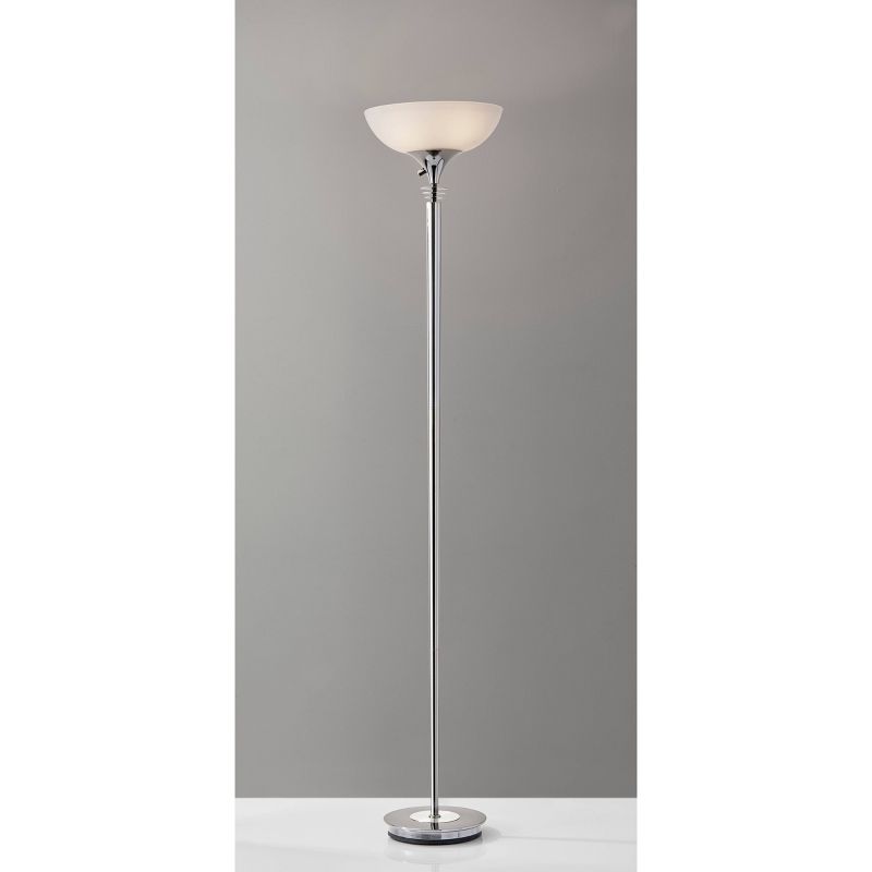 The Metropolis Floor Lamp is a sleek, contemporary style with a dramatic brushed steel finish and elegant frosted glass bowl shade. An Adesso patented 300 Watt Double Socket construction allows for two crisscrossed sockets, each holding on/off 150 Watt incandescent or LED bulbs which provides approximately 3 times more light than a typical torchiere. A simple high/low rotary switch is located on the shade cup to adjust the brightness. This lamp has a black cord and is smart outlet compatible. Bulbs are not included. Use incandescent bulbs up to 150W or dimmable led bulbs (DO NOT USE: 3-way bulbs or CFL's)
