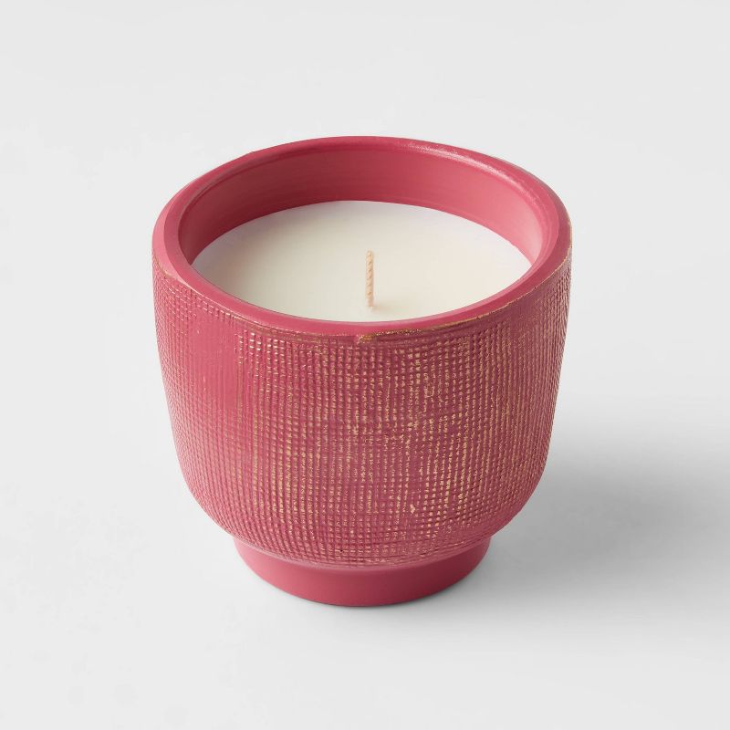 Excellent for aromatherapy, the Global Terracotta Jar Candle - Opalhouse⢠makes for a great relaxing evening. Molded into a decorative and reusable neutral shade terracotta body, this candle burns for 35 hrs, acting as the perfect stress buster. With one long wick, this 8.5-oz. candle is great for meditation, keeping you fully immersed in tranquility. With palm oil and paraffin wax blend, transcend to a whole another level of peace and comfort.