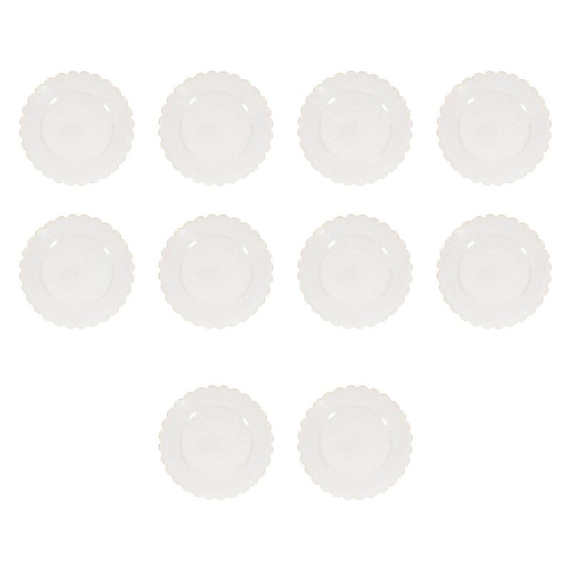 Create a pretty table setting with these 8-Count White Plastic Scalloped Snack paper plates from Spritz™. This handy pack of snack paper plates makes a great addition for any event or occasion. Sporting a scalloped design infused with gold glitter, these plastic paper plates add elegance and glamour to any table setting. Ideal for serving a range of snacks or side dishes, they can be conveniently hand washed for easy care.