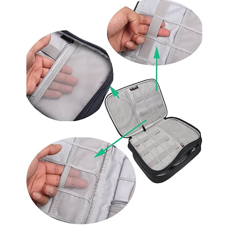 Weight: 0.41 kg. Durable Shockproof Waterproof. All the items in this bag will be protected very well. The high-quality zippers are sturdy and durable. *****The top layer has 9 elastic loops and 8 mesh pockets; The bottom layer has 2 large mesh pockets, a Neoprene soft sleeve for iPad and 3 adjustable padded dividers. *****It can hold cables, external driver, flashdrive, basic first aid items, several USB cables, scissors, makeup, passport, memory cards, mini cameras, smartphones. The design of the case allows you easy to get them in and out of. *****Excellent Protection - Well padded semi flexible covers and lining offer excellent protection for your Gadgets*****Different size sections help you to sort and store your items. It is great for being able to see all your items and keeping them in order. You can take it on a long trip.
