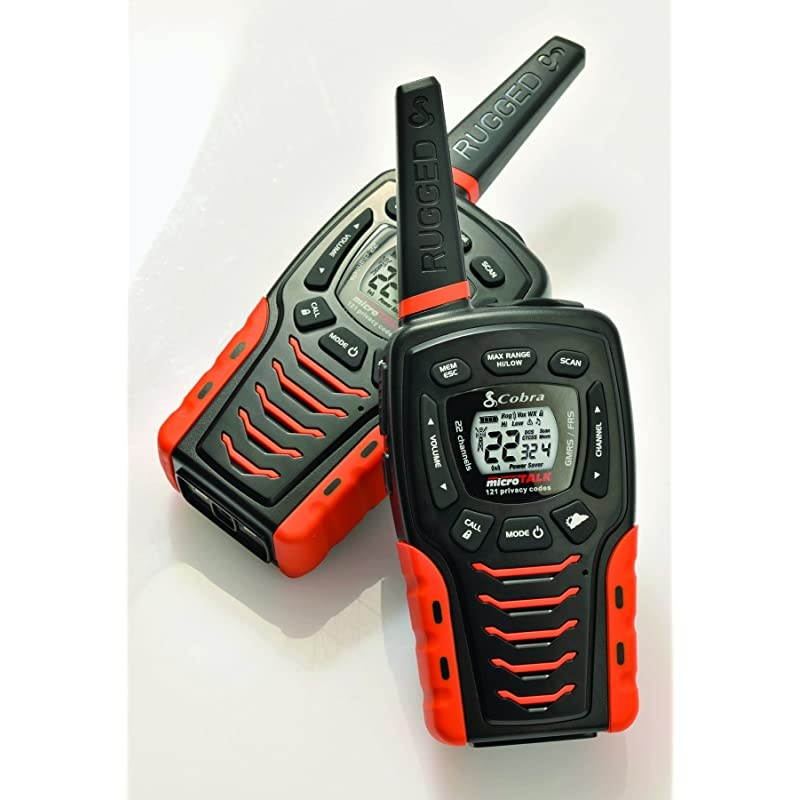 Pattern Name: RadiosMeet the new Rugged-Ready 35 Mile Walkie Talkies from Electronics. Be prepared for storms and emergencies with built-in NOAA radio receiver. The built-in LED Flashlight and rubberized grips provide enhanced functionality to keep you on the go. VibrAlert notifies you of incoming transmissions with enhanced vibrating feedback. IPX4/JIS4 waterproof spec allows you to be ready for whatever mother nature can throw at you. Voice-activated transmission frees hands for other tasks. A total of 3124 channel combinations are available when the 22 channels are combined with the 142 privacy codes (38 CTCSS/104 DCS). The radios include rechargeable NiMH batteries and a two-port charging dock. May also be used with AA alkaline batteries. Both radios must be tuned to the same channel to communicate.