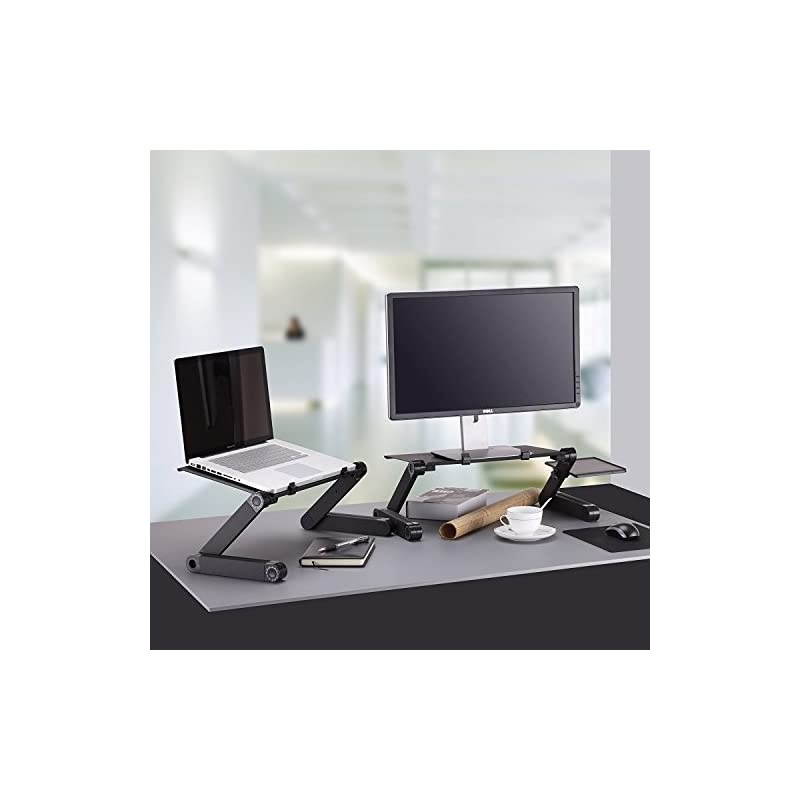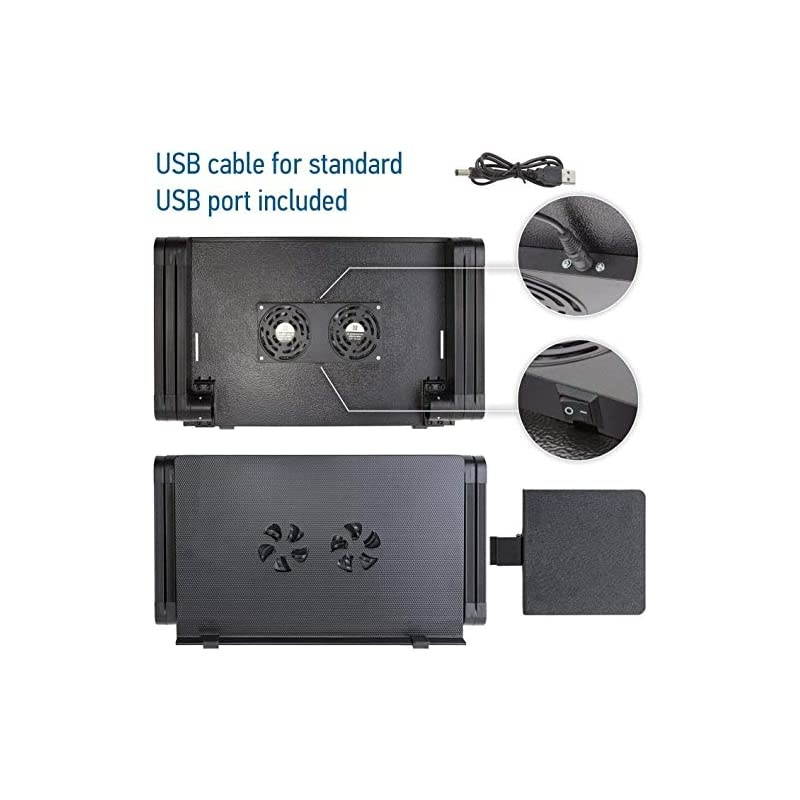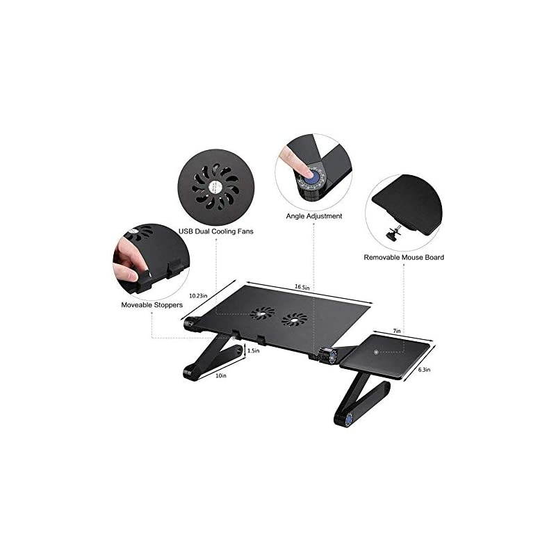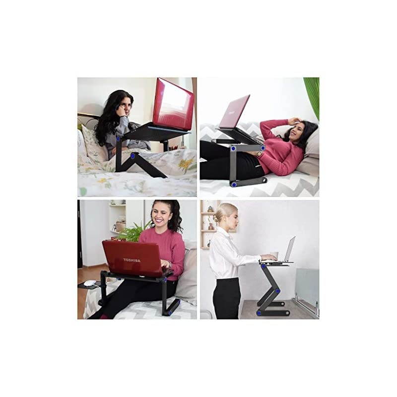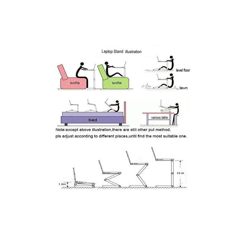 Object: adults, children and all the crowds. *****SUPER MATERIAL - These laptop tables are made of lightweight and high-strength aluminum with 2 non-slip buckle and 6 sturdy adjustable ABS auto-locking joints. Convenient to use and carry with. *****ERGINOMIC DESIGN - This laptop desk is designed with full control and flexibility for your convenience so that you can use your computer at the most comfortable position. It will reduce neck and shoulder stress due to hours of using your computers, benefits your health and make you free from the neck ache and shoulder pain caused by poor posture. *****HEAT DISSAPATION - Ventilation fans could provide strong air flow to dissipate the heat from bottom of your notebook for better heat dissipation, it's more silent. *****ADJUSTABLE HIGHT - E
