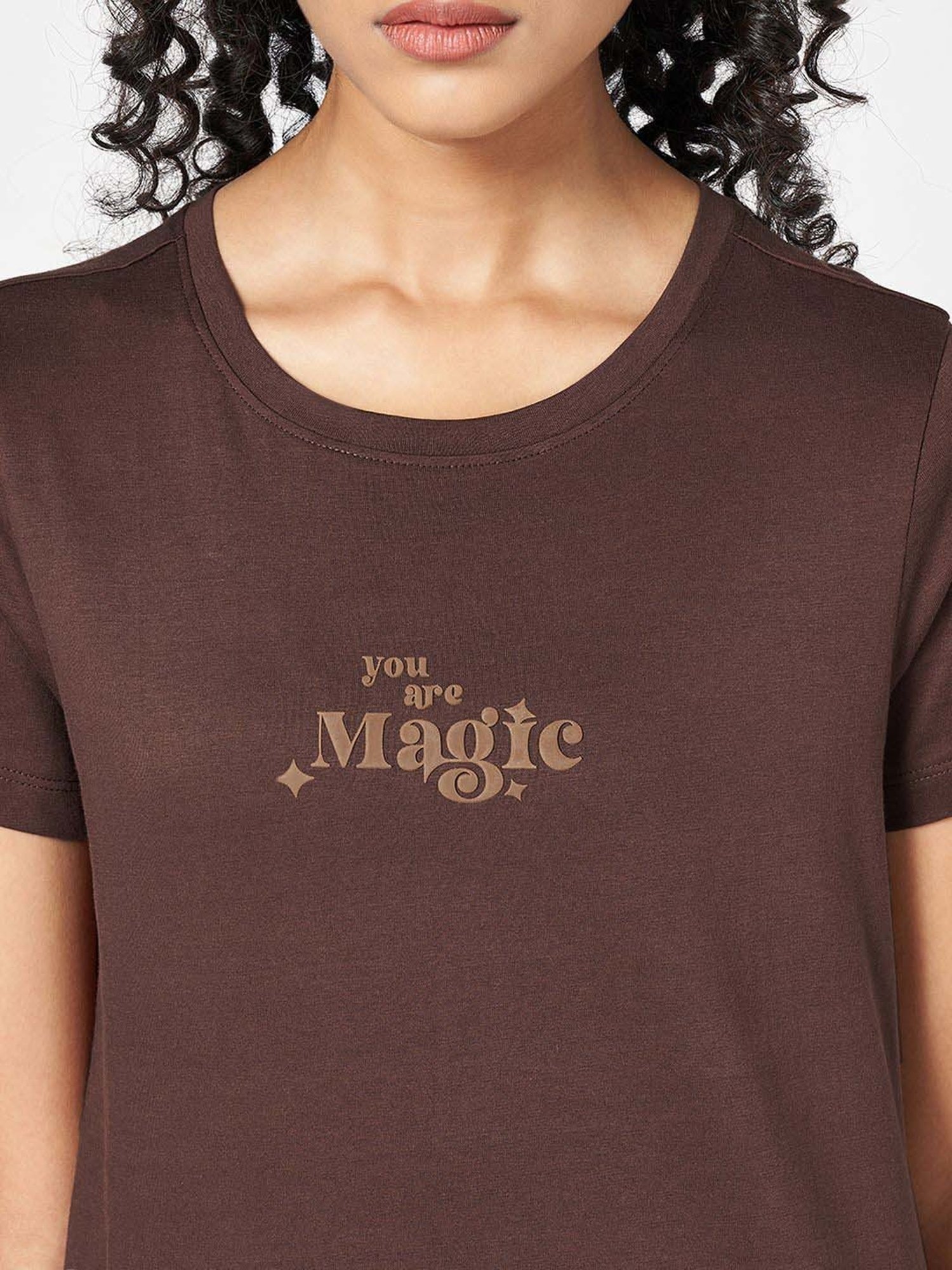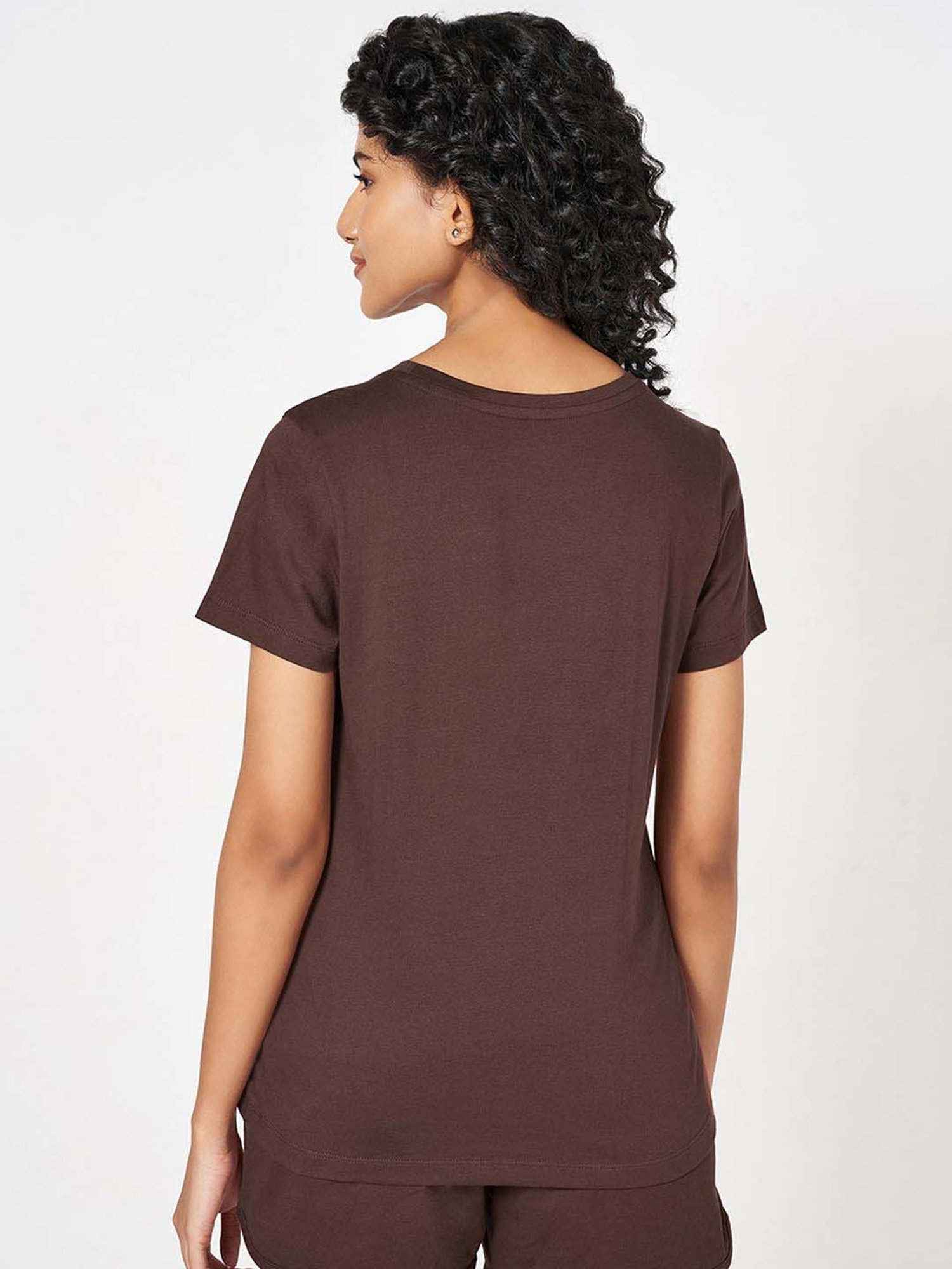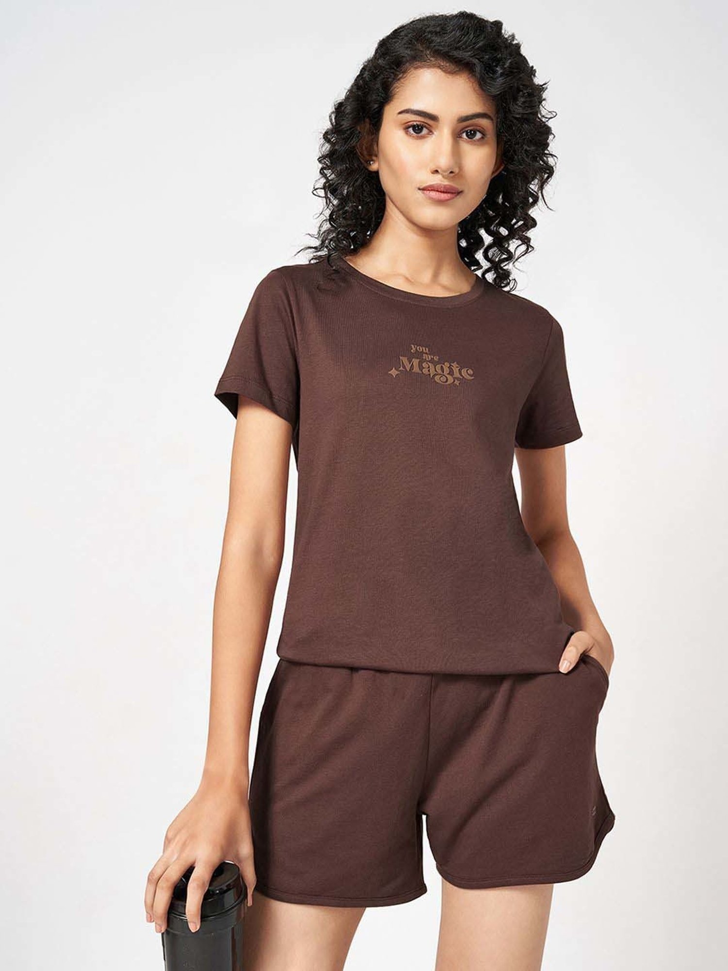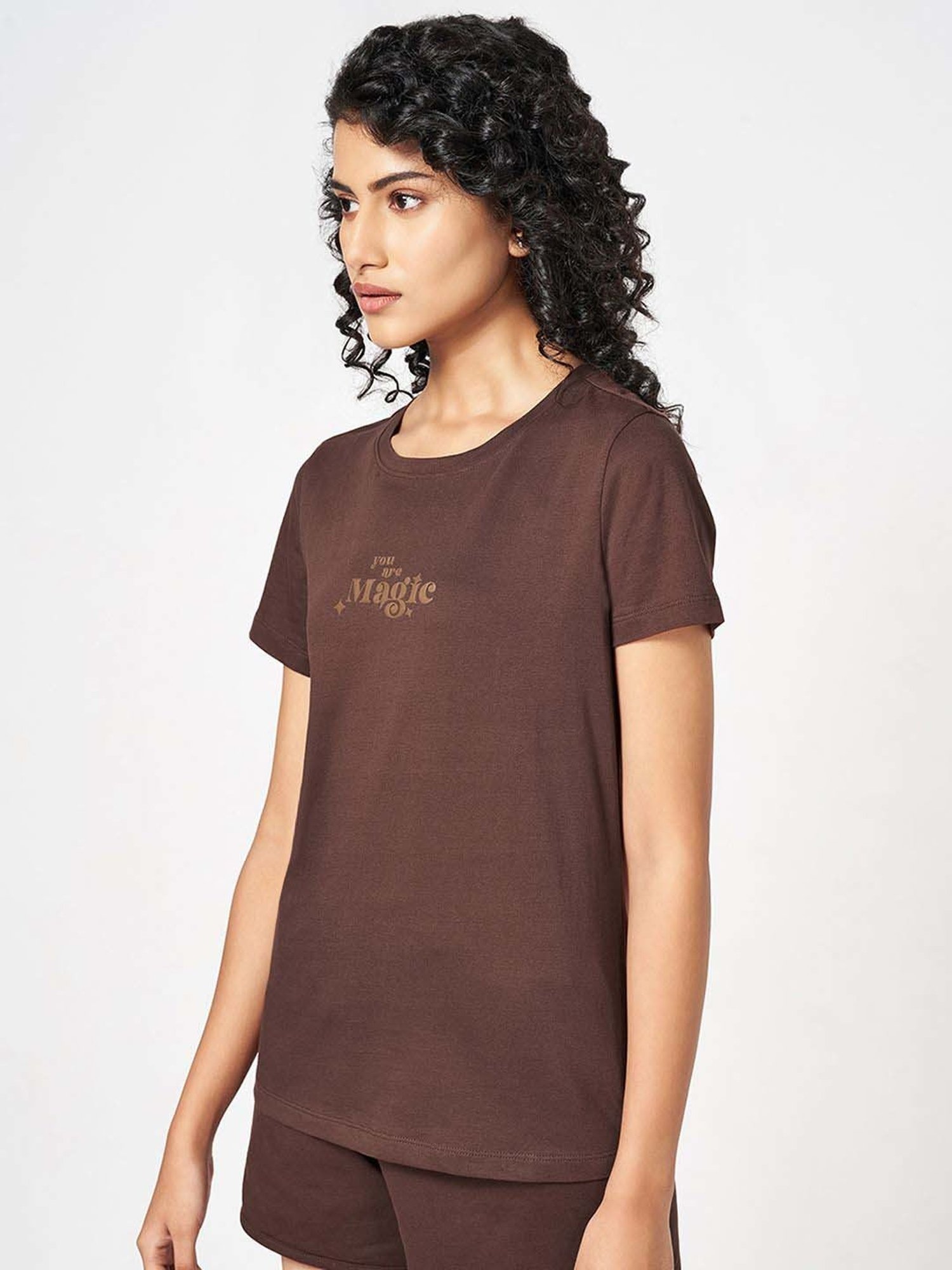 This brown t-shirt from Ajile by Pantaloons is sure to make a style statement. Tailored to sartorial perfection from premium quality fabric, it assures a soft and soothing touch against the skin. The round neck adds to its appeal. Exuding short sleeves, it is sure to fetch you compliments from all. The printed pattern makes it a captivating choice.