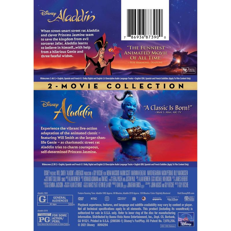 Soar away on a magic carpet ride of non-stop laughs and thrills in one of the most spectacular adventures of all time. Experience the wonders of Aladdin like never before-from the Academy Award-winning music to the unforgettable moments of sidesplitting comedy and soaring adventure. In the heart of an enchanted city, a commoner named Aladdin and his mischievous monkey Abu battle to save the free-spirited Princess Jasmine from the schemes of the evil sorcerer Jafar. Aladdin's whole life changes with one rub of a magic lamp as a fun-loving, shape-shifting Genie appears and grants him three wishes, setting him on an incredible journey of discovery. From Disney comes the thrilling and vibrant live-action adaptation of the animated classic Aladdin, the exciting tale of the charming street rat Aladdin, the self-determined Princess Jasmine and the Genie who may be the key to their future.