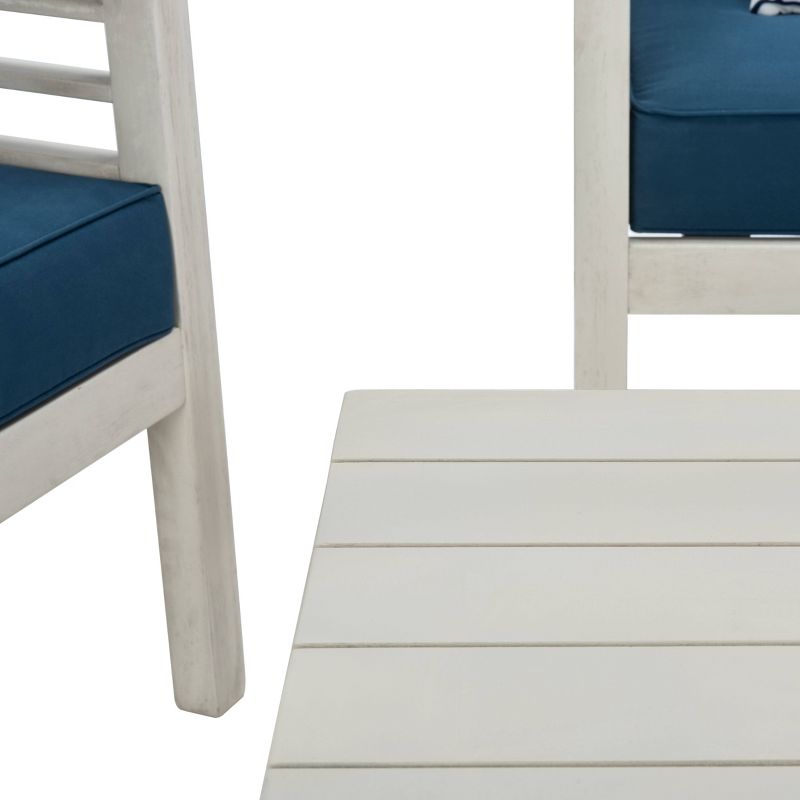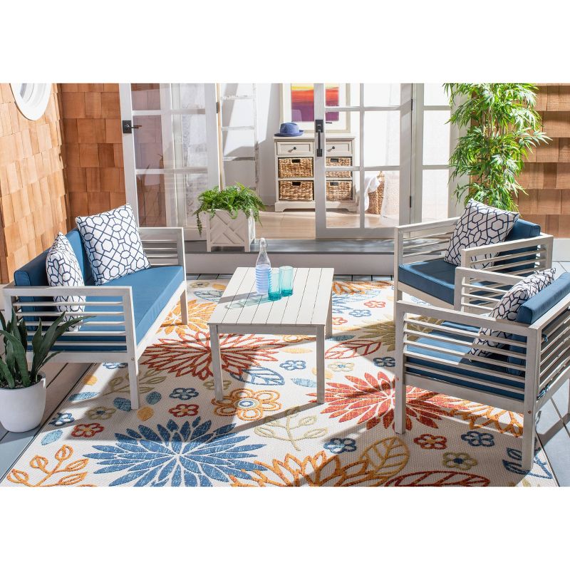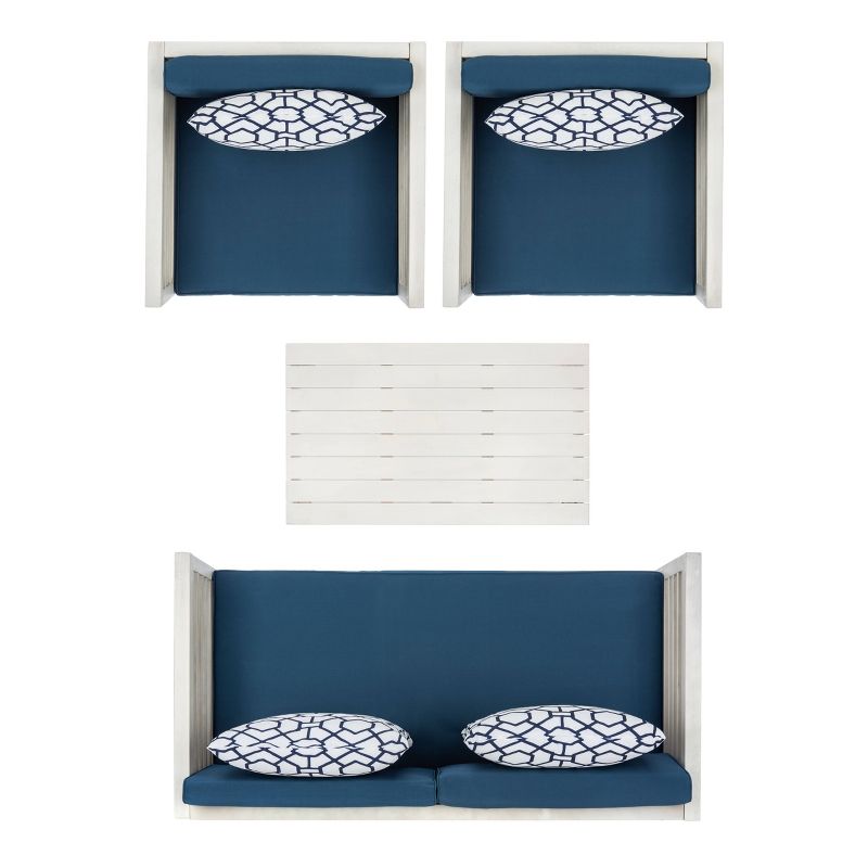 Inspired by Barcelona’s coastal style, this contemporary 4 piece outdoor set is a new classic. Designed with chic clean lines, each piece is finished in clean white and upholstered in rich navy for timeless appeal. Its square white trellis accent pillows are complementary. This conversation set is a great addition for any outdoor space.