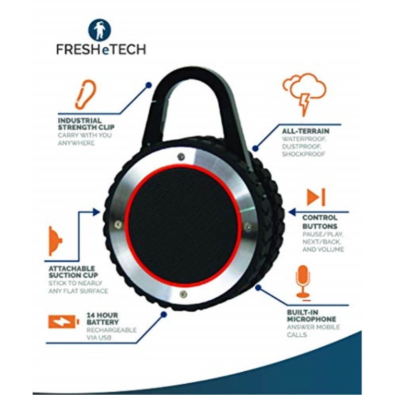ALL-Terrain Sound is a Rugged, Waterproof, Outdoor, Bluetooth speaker designed to keep up with your active lifestyle.From the beach, to fishing, camping, playing a round of golf, or riding your bike, the applications of this portable outdoor speaker are limited only by your imagination. Built to take on the elements, ATS handles sand, rain, mud, and millennials like a champ. This portable Bluetooth speaker gives users the ability to pause/skip songs, adjust volume, and answer phone calls directly from the device, so there's never a reason to put your phone in harm's way while enjoying the outdoors. Features: Rechargeable Lithium Battery Fully Charges in 90 minutes via Micro USB 14 hours of continuous playing Waterproof and floats Bluetooth 4.0 (high quality sound) Tested Ruggedized Durability (10 foot drop onto concrete) Loud sound (3 watts) Industrial Strength Clip (poly carbonate material) Control Buttons: Skip, Back, Pause/Play, Answer/End Calls, Volume , Volume Built-in high quality microphone for speaker phone conversations