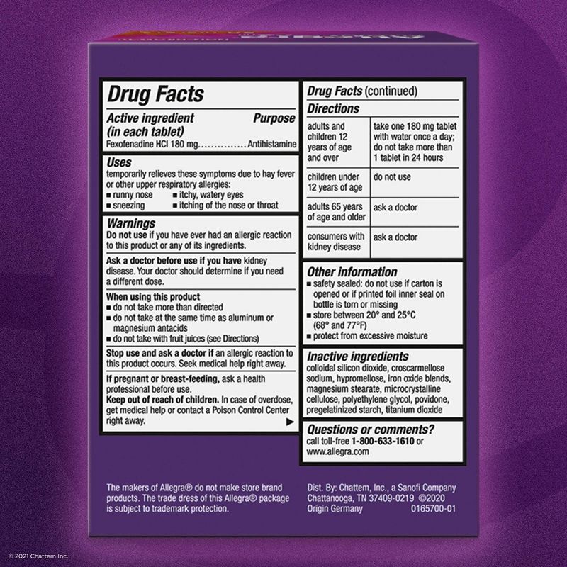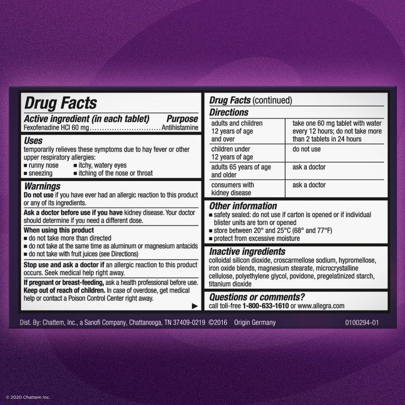 For your worst allergy symptoms, nothing works faster or stronger* than Allegra 24-Hour Adult Non-Drowsy Antihistamine Tablets. Allegra Tablets start working in one hour to give you round-the-clock relief from sneezing, runny nose, itchy and watery eyes, and itchy nose or throat. One pill is all you need for 24-hour relief. Formulated with active ingredient fexofenadine, Allegra Non-Drowsy Allergy Medicine provides powerful relief from indoor and outdoor allergies, including seasonal allergies and pet allergies. Be ready for spring allergies, fall allergies, dog allergies and more. Stock up on Allegra 24-Hour Non-Drowsy Tablets for fast*, effective allergy relief. *Starts working in one hour; applies to first dose only. Among single-ingredient branded OTC oral antihistamines.
