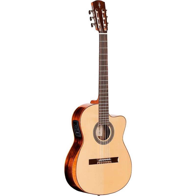 Alvarez's CC7HCEAR Cádiz Classical Hybrid acoustic-electric is a beautiful instrument made from Sitka and walnut with a flawless gloss finish and acacia binding and armrest. It has a 14th fret neck joint, radius fingerboard and narrower nut width making it a great guitar for steel string players looking for a nylon string sound, without such a departure from a steel string in terms of feel and playability.Cádiz SeriesCádiz offers responsive and engaging nylon string guitars of solid quality and excellent playability. Everything about them is considered and chosen. They are a new shape, different from classical guitars Alvarez has made in the past, slightly taller, slightly narrower, more elegant.In order to make the guitars as responsive as possible, Alvarez kept them as light as possible in construction while staying true to traditional design. So in the standard models there are no trussrods. The necks are three-piece and a solid ebony center rod gives them the strength and lightness needed.Cádiz models are also made with a Spanish heel neck joint. Ramirez and other great luthiers were a huge influence when it came to choosing scale length. The Cádiz scale length is longer than the standard 650 mm (25.6”) will find on many classical guitars. At 662 mm (26.06”) the Cadiz scale length raises the tension just a little and helps deliver more energy into the soundbox to harness and shape. Alvarez chose AA Sitka tops on all Cádiz models, the saddle and nut are real bone, rosettes are wood mosaic and bridges and fingerboards are pau ferro or rosewood.The soundbox is more lightly built, the tops are graduated and each brace is custom cut and sanded with four varying widths in total. The bracing design gives a slight nod to Jose Ramirez III’s asymmetric architecture in the fact that these guitars have a treble bar. This is to stiffen up the treble side of the top a little more which helps create very round, bell-like trebles on the first three strings. The bass side of the top is kept light by using slightly thinner braces, helping give the player very open, clear and strong bass response.Other fine appointments include the use of traditional cypress wood for the Flamenco model back and sides, which is paired with ebony binding.