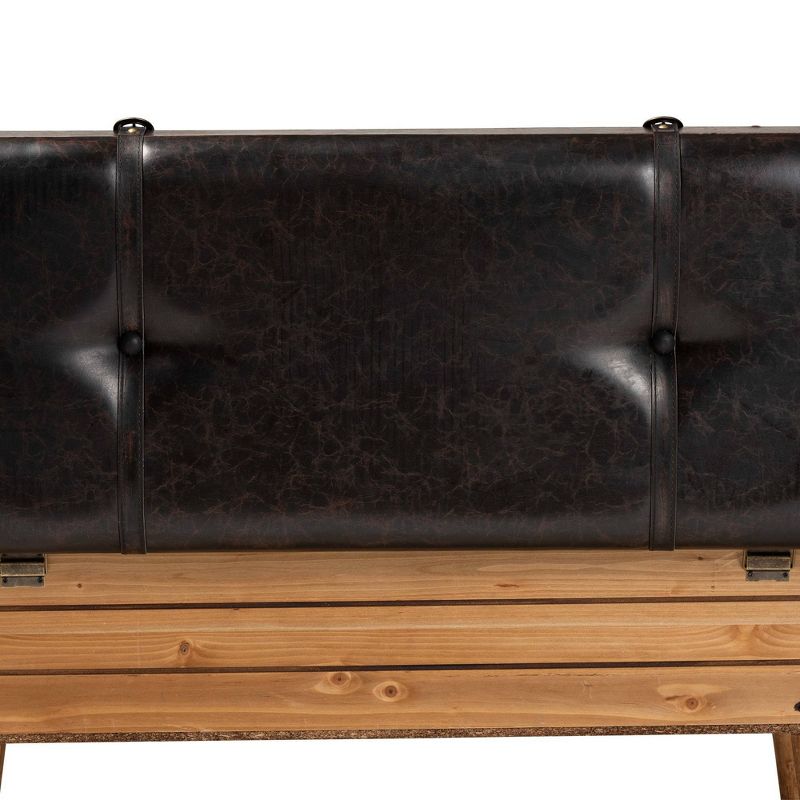 Give your space a hint of rustic flair with the charming Amena storage ottoman. Made in China, the Amena is comprised of horizontal wood panels showcasing a warm oak finish. The seat is padded with soft foam and upholstered in smooth PU leather for superb comfort when used as seating. Requiring assembly, its top lifts up to reveal ample storage space for blankets and more. PU leather straps and brass finished metal studs lend a charming, vintage trunk inspired look. Angled legs complete the look, making the Amena storage ottoman a fantastic addition to the modern home.