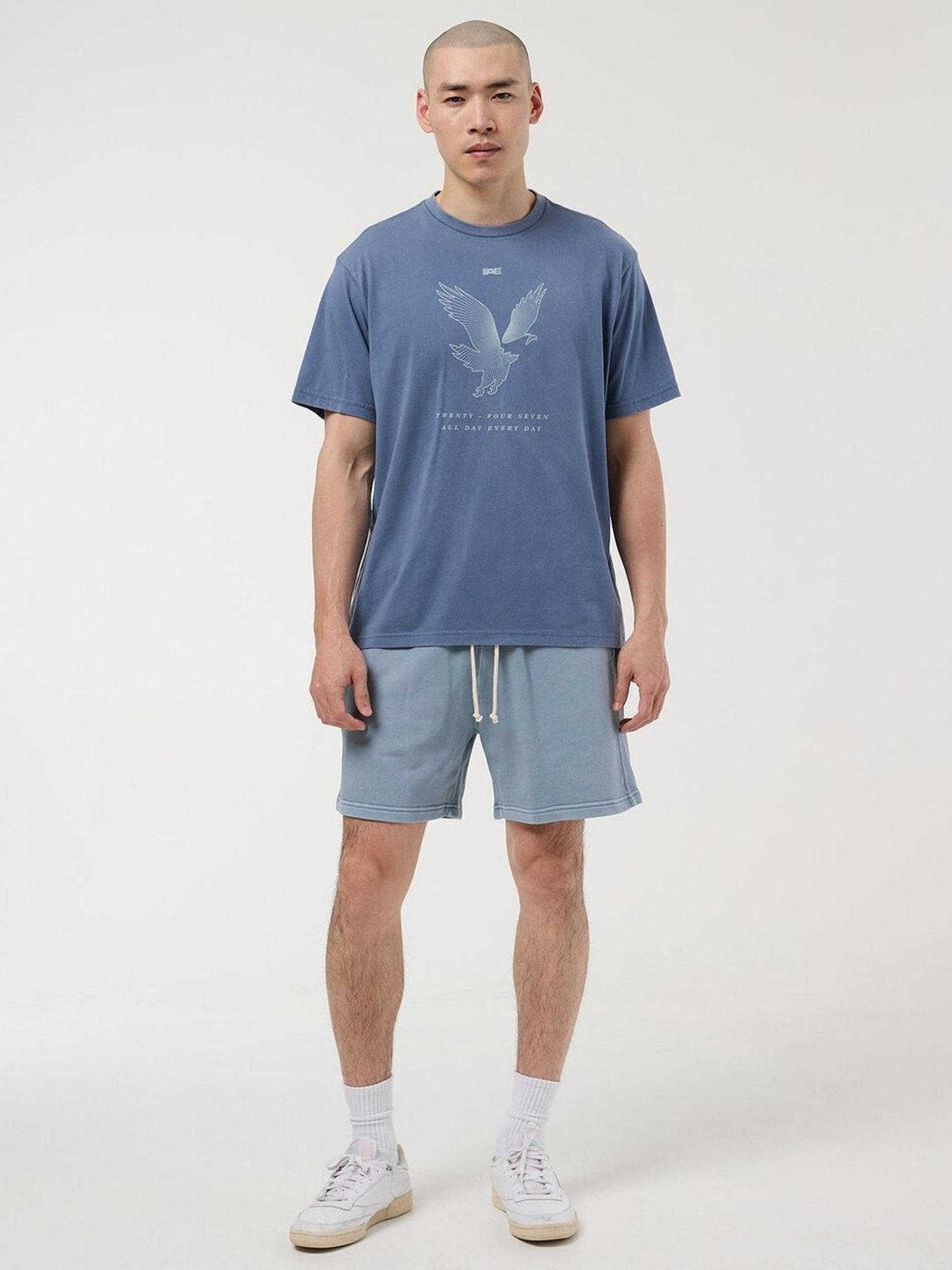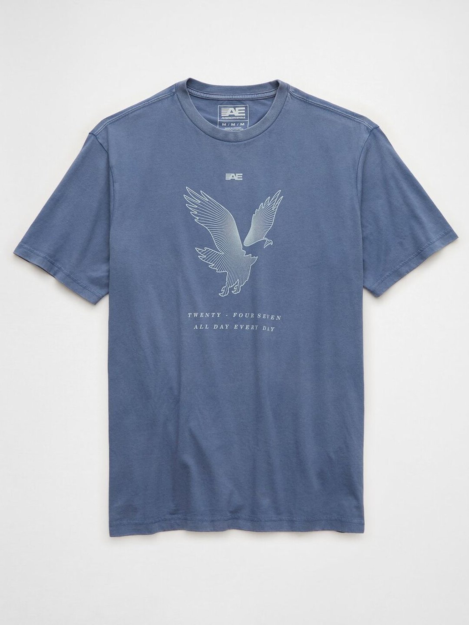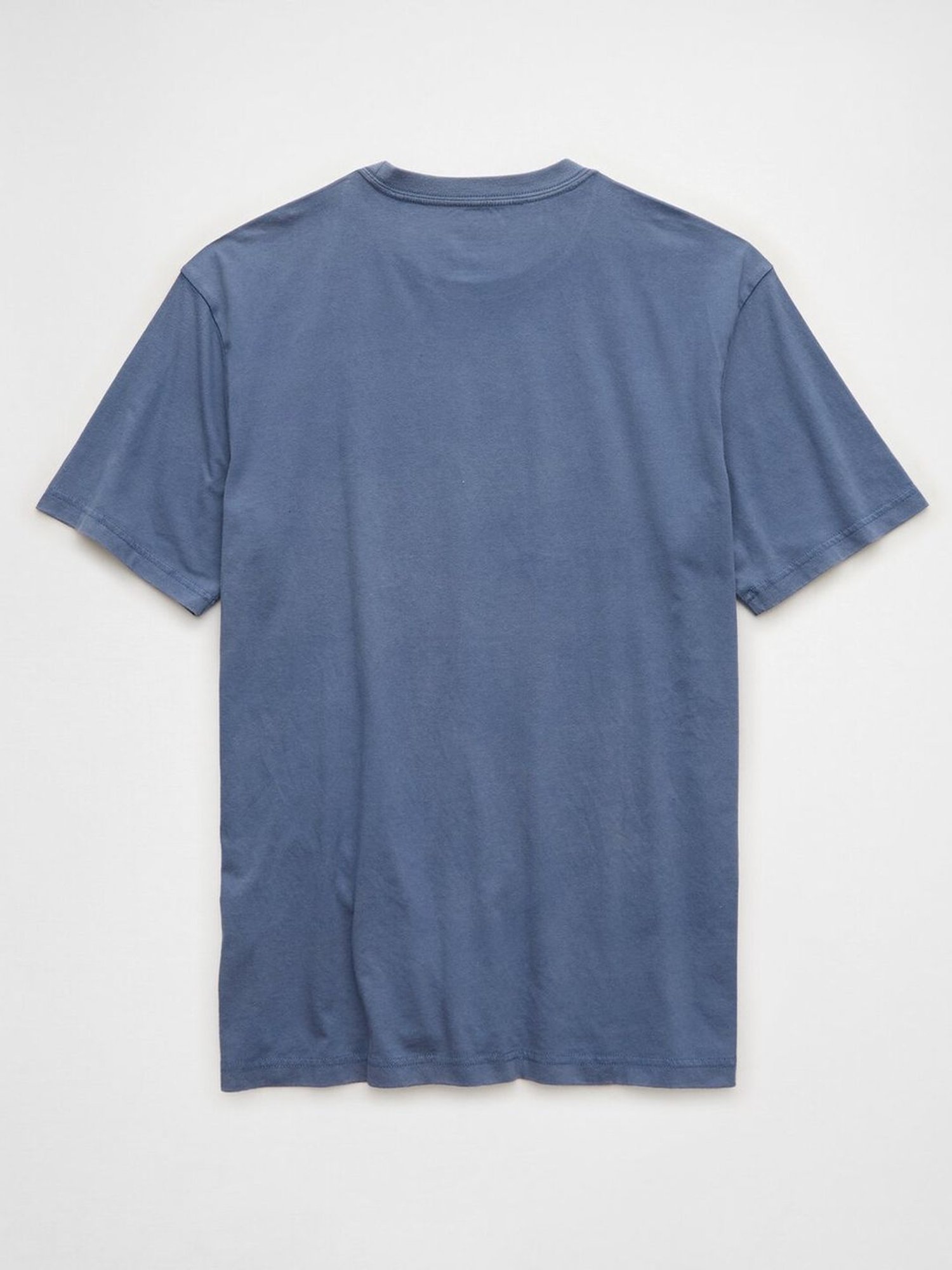 Give yourself a modish look with this blue regular fit t-shirt from American Eagle. Tailored to sartorial perfection from premium quality fabric, it assures a soft and soothing touch against the skin. The round neck adds to its appeal. Exuding short sleeves, it is sure to fetch you compliments from all. The printed pattern makes it a captivating choice.