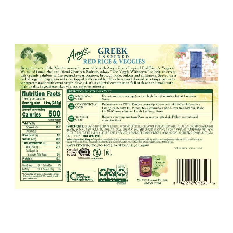 We asked famed chef and friend Charleen Badman, a.k.a. "The Veggie Whisperer," to help us create this organic rainbow of fire roasted sweet potatoes, broccoli, kale, onions and chickpeas. Served on a bed of organic long grain red rice, topped with crumbled feta cheese and dressed in a tangy red wine vinaigrette made with extra virgin olive oil, it's a colorful combination full of flavor and made with high-quality ingredients that can be enjoyed in minutes. Amy's Greek Red Rice & Veggies is gluten free, soy free, tree nut free and certified kosher. Since 1987, we at Amy’s Kitchen have produced delicious convenient foods for people who are sometimes too busy to cook. Amy’s is a family-run business, and we supervise every aspect of our business and take pride in customer satisfaction. All the fruits, vegetables and grains we use are grown without the use of insecticides, GMOs and other harmful chemicals. We prepare these ingredients with the same careful attention in our kitchen as you would in your own home for high-quality, home-style vegetarian and vegan meals. No meat, fish, shellfish, poultry, eggs or peanuts are ever used in any Amy's products. Even though you're heating up our meals in your home, we want each bite to taste like you're a guest in ours.
