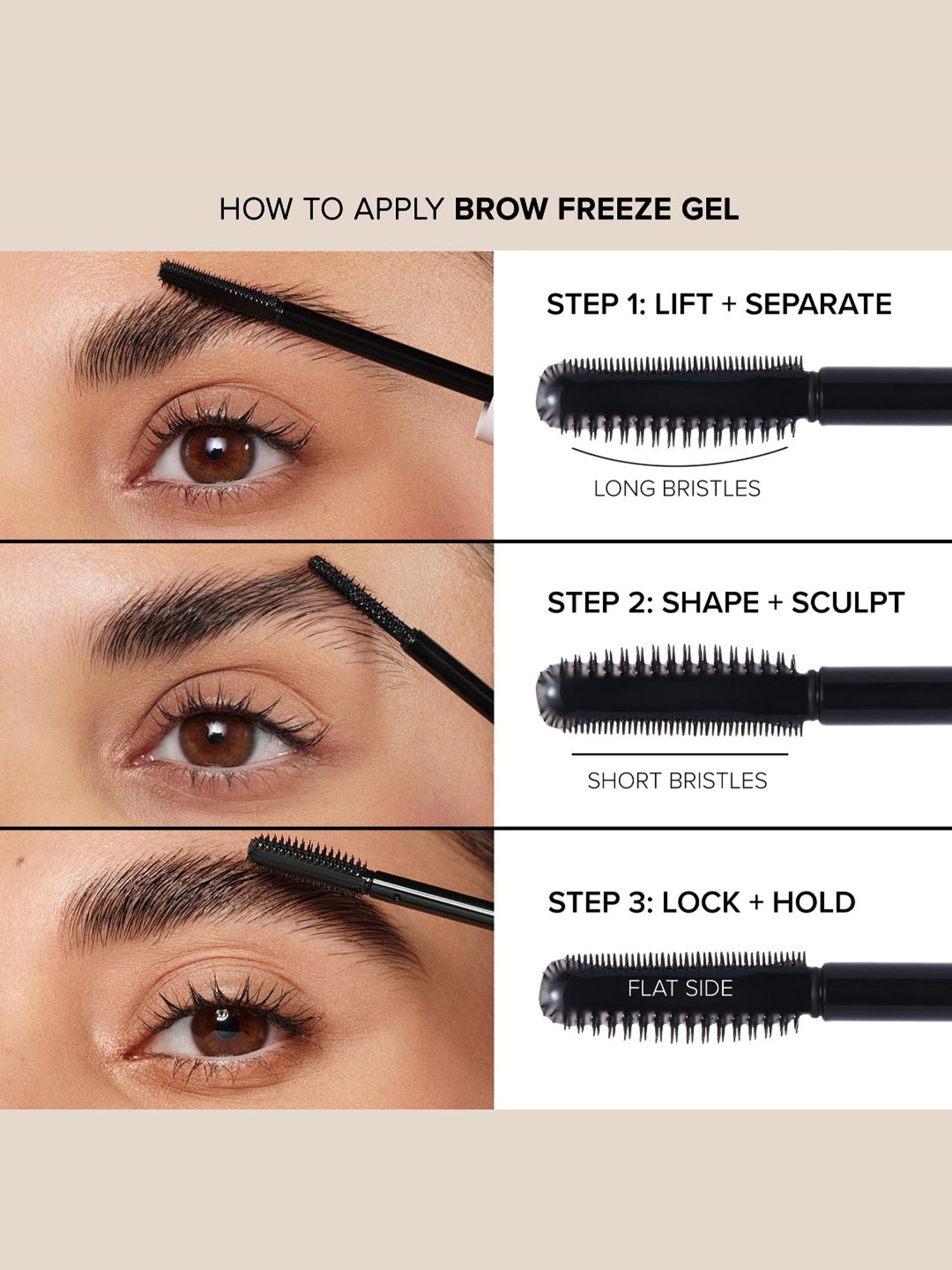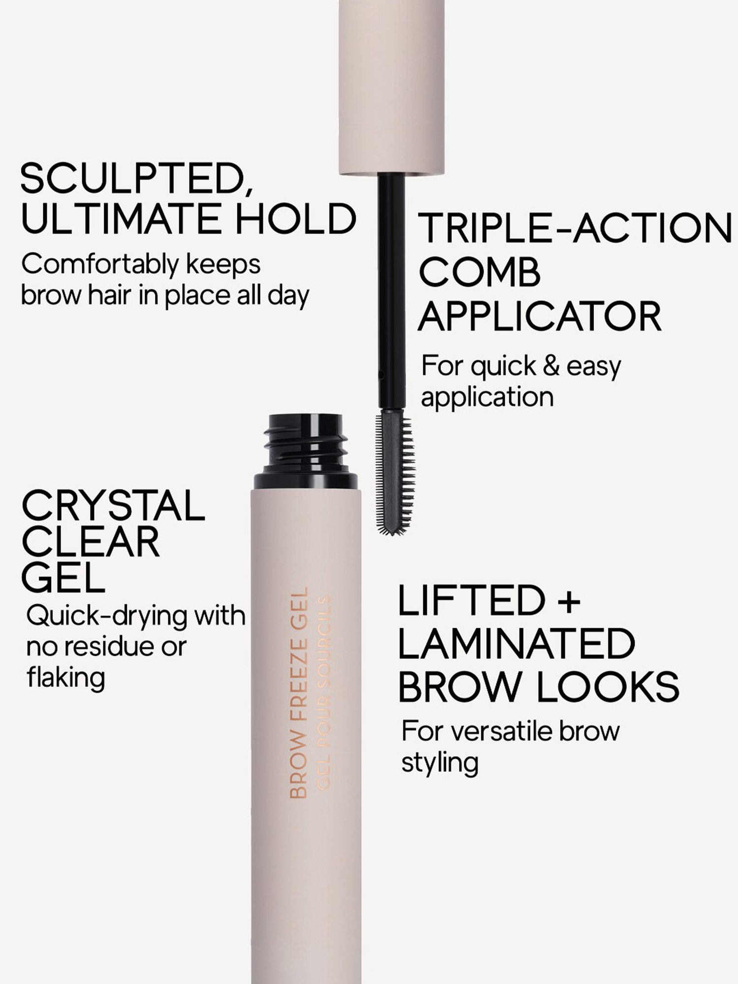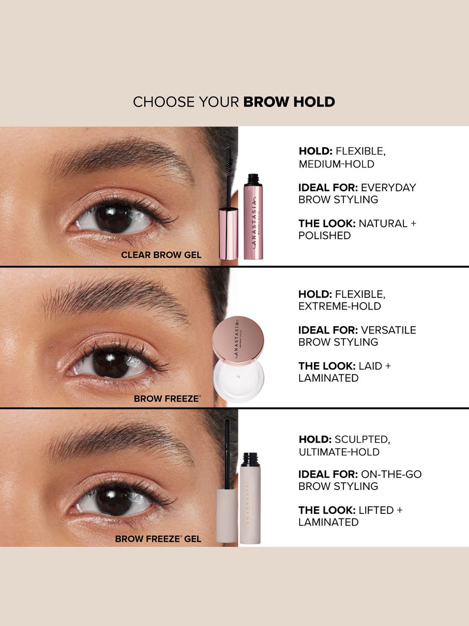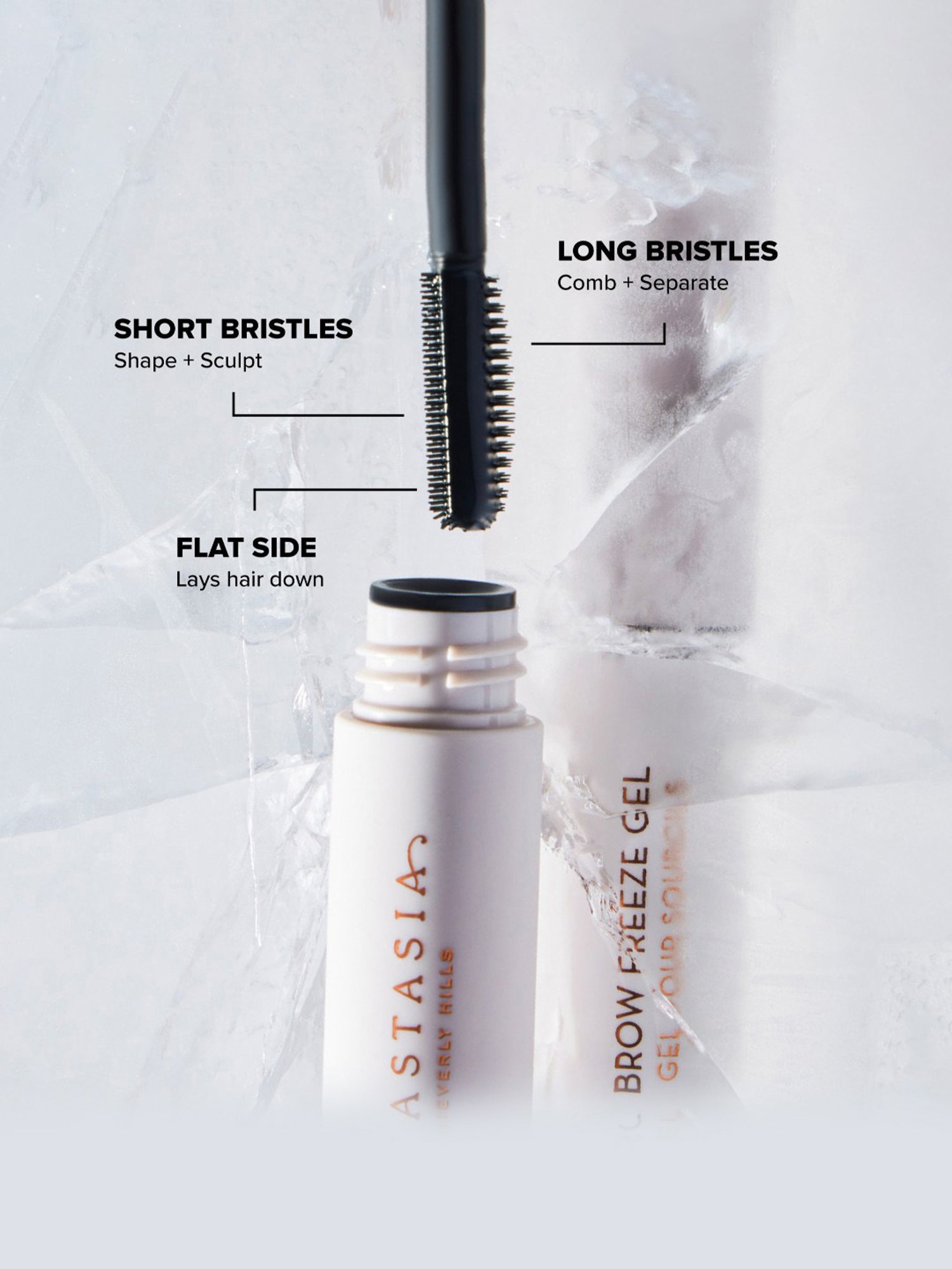 Introducing new Anastasia Beverly hills Brow Freeze Gel, an innovative clear brow wax gel hybrid featuring a dual action comb applicator that shapes, sculpts and sets brows with extreme hold and precision on-the-go. Achieve lifted, laminated look brows with hair loving frozen technology.