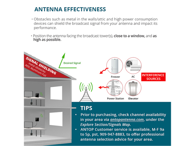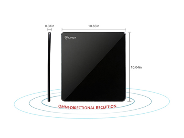 The ANTOP Flat-Panel AT-206 designed in Piano Black is aesthetically pleasing and suitable to match a wide range of home dcor styles. Its compact size allows you to position the antenna anywhere in your home. The AT-206 supports HDTV, 1080P TV and 4K ULTRA HD and is compatible with TV converter boxes or digital TVs. The number of TV channels and programs that you can receive for FREE depends on the amount of over-the-air broadcasters in your area. With the ANTOP AT-206, there is no monthly fee and no need to subscribe. Just plug into a TV, scan the channels, and then enjoy your TV shows! By following the simple tips below, you can enjoy FREE TV with your ANTOP Antenna: Re-scan channels monthly to find all available channels including newly added or changed. Do not place or hide the antenna in/behind any metallic objects. Inst...Directivity: Omni-directionalMaximum Antenna Range: 131.2 ftFrequency: 174 MHz to 230 MHzFrequency: 470 MHz to 700 MHzAntenna Gain: 8 dBColor: BlackHeight: 10.8Width: 10"Depth: 0.3"Form Factor: Desktop/Wall/WindowWeight (Approximate): 1.30 lbApplication/Usage: HDTV AntennaApplication/Usage: IndoorPackage Contents: Flat Panel Indoor HDTV Antenna Stand 10ft Coaxial Cable Instruction/User Manual Limited Warranty: 1 YearPackage Contents Flat Panel Indoor HDTV Antenna Stand 10ft Coaxial Cable Instruction/User Manual "