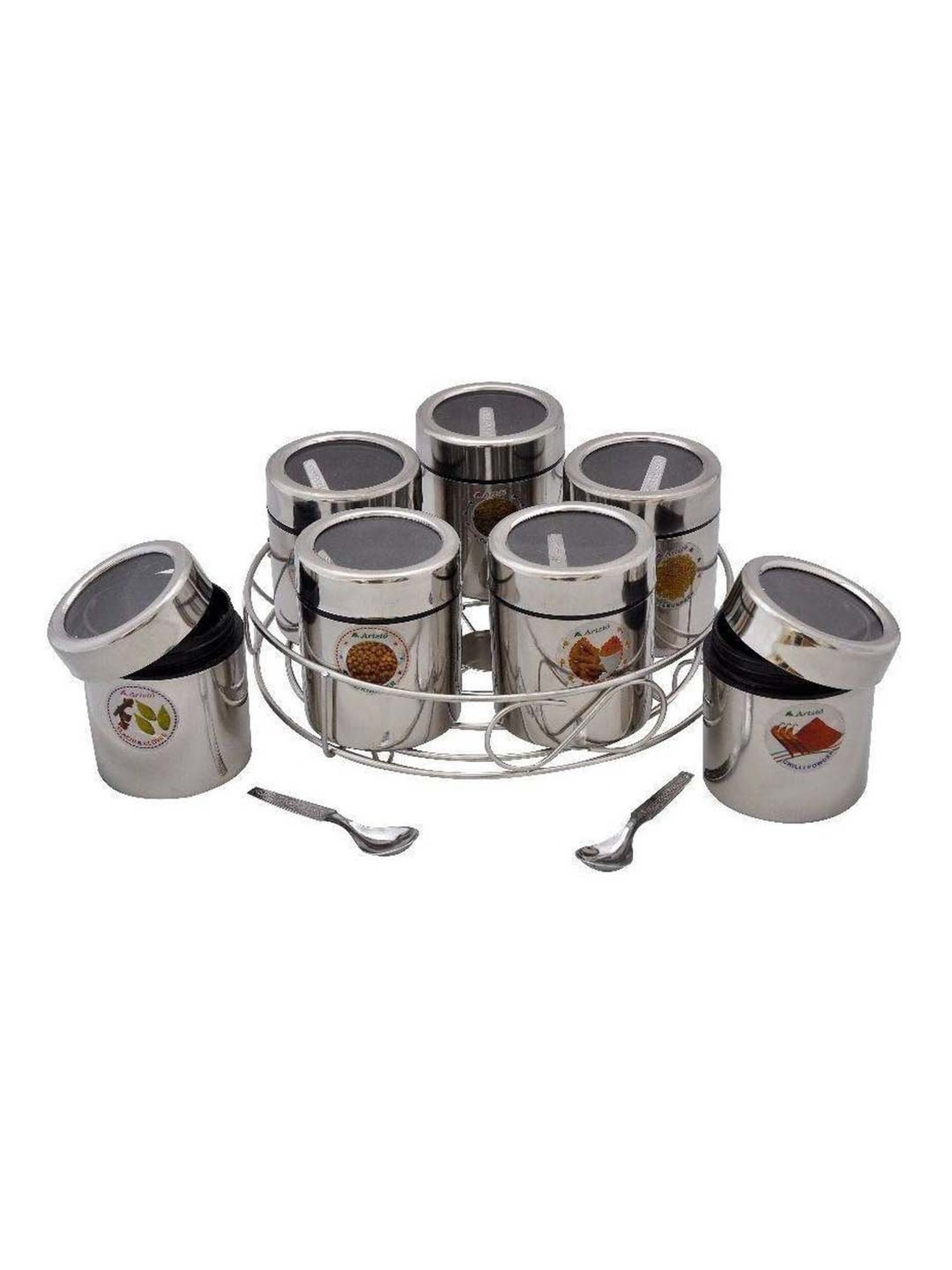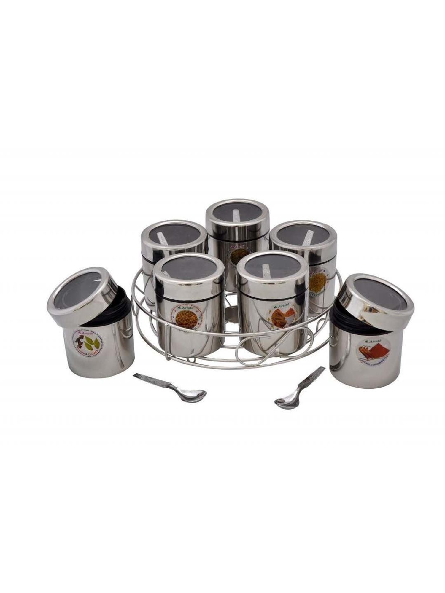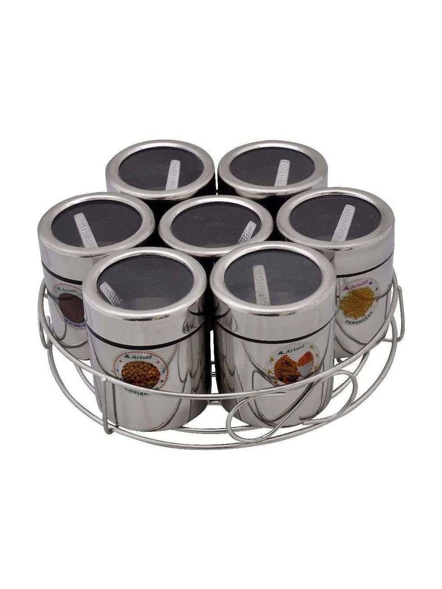 Store and showcase your favorite spices and ingredients in this Aristo storage container set with base stand. This 7in1 masala and spice stand is used for stacking daily needed items like mukhwas and spices. Its compact size makes it easy to store in the kitchen cupboards too. It is made of sturdy stainless steel material and is a set of 7 spice containers with base stand.