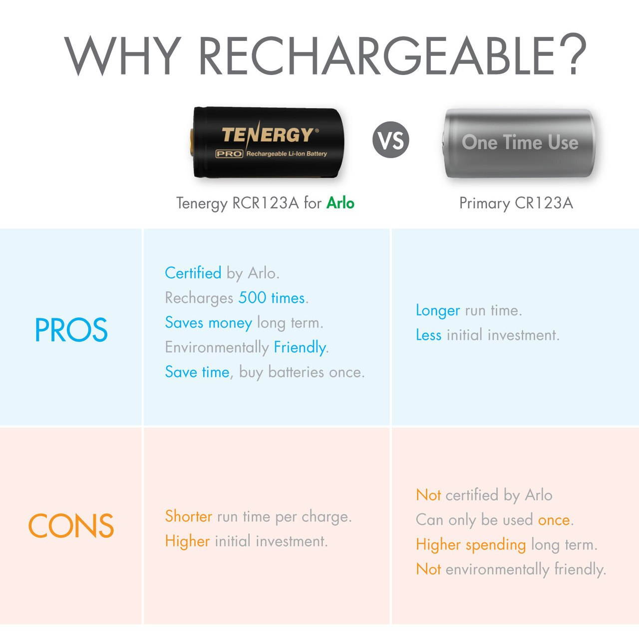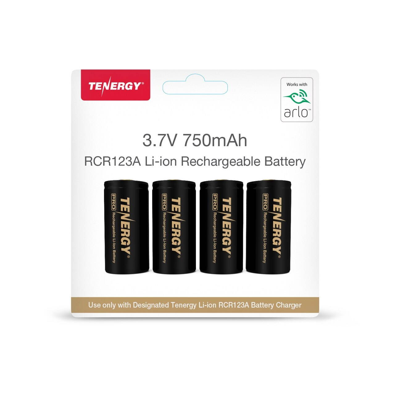 IMPORTANT! • ONLY use a compatible Tenergy Premium charger to recharge these Premium Li-ion rechargeable batteries for Arlo cameras. • This Tenergy Li-ion rechargeable RCR23A battery is intended for use in Arlo security cameras only. We cannot ensure the same high quality experience in other RCR123A devices. • DO NOT mix & use these Tenergy Li-ion 3.7V 750mAh with other capacities, chemistries, or brands. Such as the 650mAh rechargeable RCR23A battery or any one-time use Lithium CR123A batteries (for example Panasonic or Duracell Lithium CR123A). • DO NOT mix & use these Tenergy Li-ion 3.7V 750mAh rechargeable RCR23A batteries with any other rechargeable RCR123A batteries.