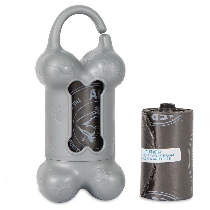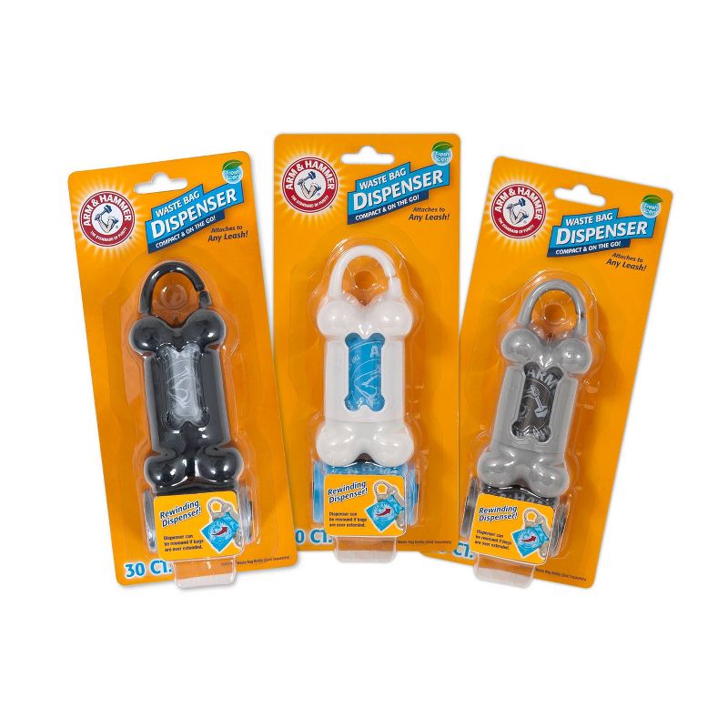 The Arm & Hammer® Bone Dispenser and included disposable waste bags have natural odor elimination from Baking Soda; plus a soft lavender scent that you and your pet will love. Unique design attaches easily to leash, bag or belt loop. Bags are infused with baking soda & scented to reduce odors! These cheerful bags are a fresh way to manage a less-than-appealing-but-totally-necessary task. Bags have a reinforced seam that adds durability. Ships in three assorted colors.