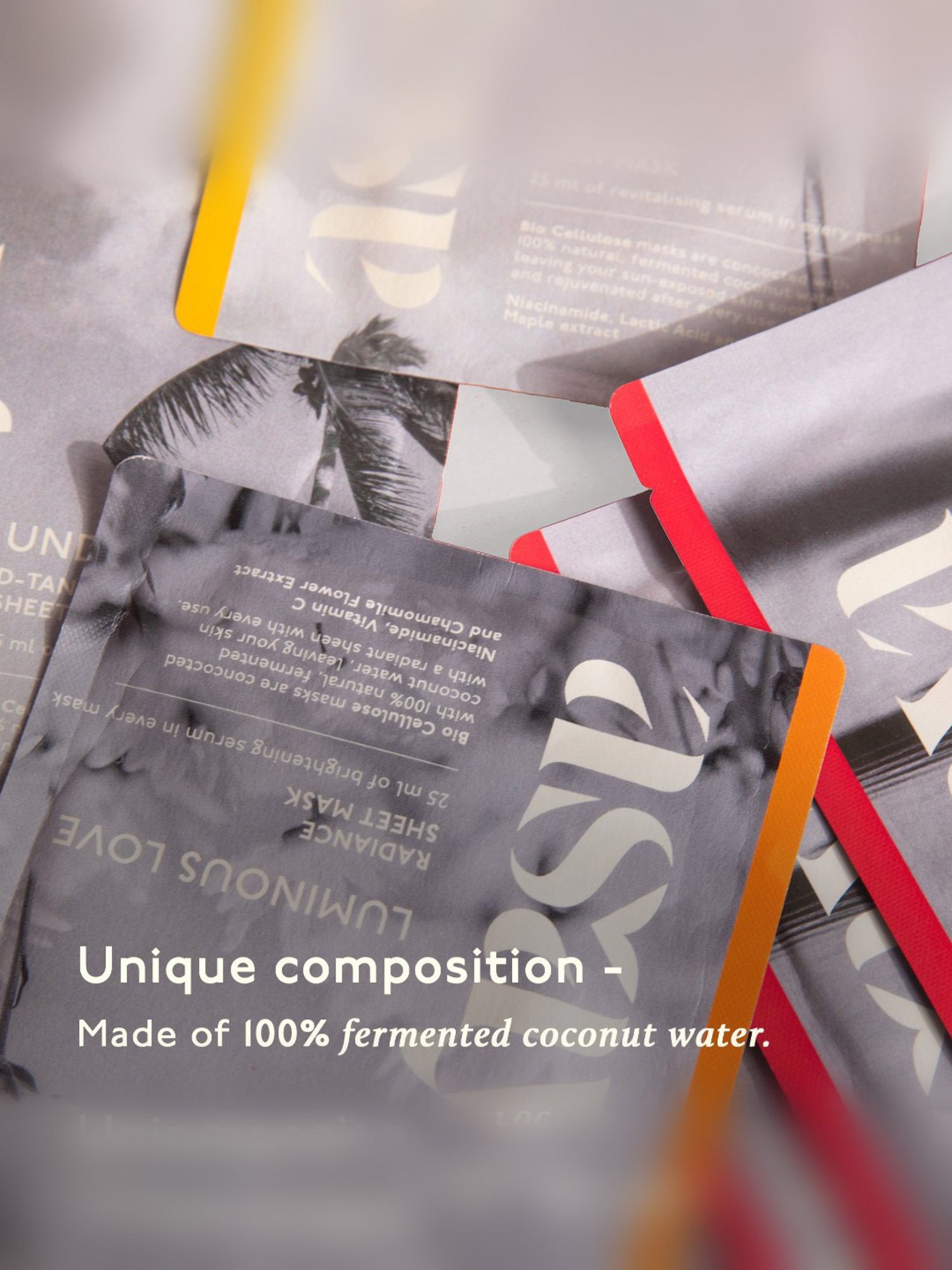 Composition: D-Tan Sheet Mask: Water, Glycerin, Butylene Glycol, Oyster Shell Extract, Niacinamide, 1,2-Hexanediol, Betaine Caffeine, Allantoin, Hydroxyethyl Acrylate/ Sodium Acryloyldimethyl Taurate, Sodium Hyaluronate, Lactic Acid, Glycolic Acid, Alpha-Arbutin, Caprylyl Glycol, Ethylhexylglycerin, Acer Saccharum (Sugar Maple) Extract, Portulaca Oleracea Extract, Chamomilla Recutita (Matricaria) Flower Extract, Arnica Montana Flower Extract, Artemisia Absinthium Extract, Achillea Millefolium Extract, Gentiana Lutea Root Extract, Chamaecyparis Obtusa Leaf Extract, Charcoal Extract, Fragrance. Intense Moisture Sheet Mask: Water, Butylene Glycol, Glycerin, Dicaprylyl Carbonate, Centella Asiatica (Gotu Kola) Extract, Hyaluronic Acid, Chamomilla Recutita (Chamomile) Flower Extract, Arnica Montana Flower Extract, Gentiana Lutea Root (Bitter Root) Extract, Achillea Millefolium Extract, Artemisia Absinthium Extract, Betula Alba Bud Extract, Corylus Avellana (Hazelnut) Bud Extract, Olea Europea (Olive) Bud Extract, Juglans Regia (Walnut) Leaf Extract, Citrus Grands (Grapefruit) Seed Extract, Bambusa Textilis Stem Extract, Pinus Palustris Leaf Extract, Buddleja David (Summer Lilac) Extract, Thymus Vulgaris (Thyme) Flower/ Leaf Extract, 1, 2-Hexanediol, Saccharide Isomerate, Citric Acid, Sodium Citrate, Hydroxyethyl Acrylate/ Sodium Acryloyldimethyl Taurate Copolymer, Propanediol, Caprylyl Glycol, Ethylhexylglycerin, Linalyl Acetate, Ethylene Brassylate. Radiance Sheet Mask: Water, Butylene Glycol. Niacinamide, Glycerin, Ascorbic Acid, Thiamine HCI, Cyanocobalamin, Riboflavin, Pyridoxine, Folic Acid, Menadione, Bioflavonoids, Biost TocopheryL Acetate, Glutathione, Panthenol, Aloe Barbadensis Leaf (Aloe Vera) Extract, Chamomilla Recutita (Chamomile) Flower Extract, Arnica Montana Flower Extract, Gentiana Lutea Root Extract, Achillea Millefolium Extract, Artemisia Absinthium Extract, Malva Sylvestris (Mallow) Extract, Mentha Piperita (Peppermint) Leaf Extract, Primula Veris Extract, Alchemilla Vulgaris Extract, Veronica Officinalis Extract, Melissa Officinalis (Lemon Balm) Leaf Extract, Citrus Grandis (Grapefruit) Seed Extract, Bambusa Textilis (Bamboo) Stem Extract, Pinus Palustris Leaf Extract, 1, 2-Hexanediol, Hyaluronic Acid, Hydroxyethyl Acrylate/ Sodium Acryloy|dimethyl Taurate Copolymer, Caprylyl Glycol, Ethylhexyiglycerin, Propanediol, Citrus Limon (Lemon) Peel Oil, Limonene, Isopropyl Myristate, Citral.