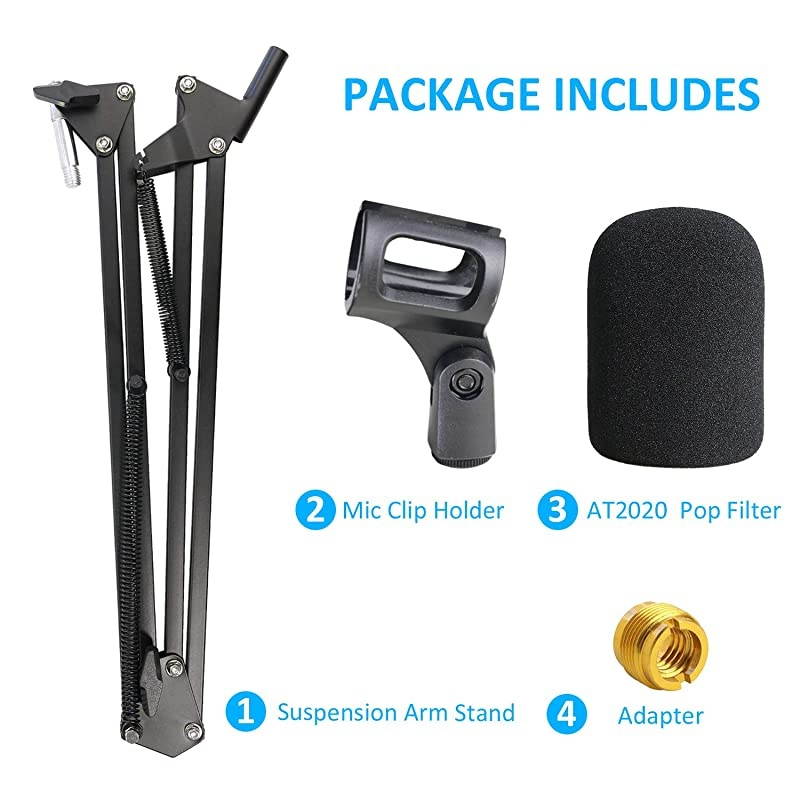The boom arm has knobs on two of the hinges you can tighten to make it stay in one place. It is easy to install. Takes less than five minutes. Foam pop filter cover is high density, filters noise to the lowest. Picks your original sound only. Say goodbye to complicated post-production. Package included 1 X NB-35 Mic Boom Arm Stand 1 X Mic Clip Holder 1 X AT2020 Foam Pop Filter 1 x Table Mounting Clamp Frequently Asked Questions: