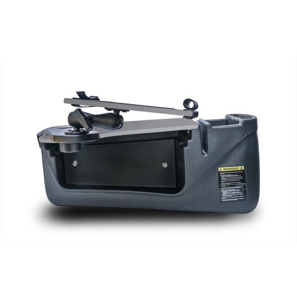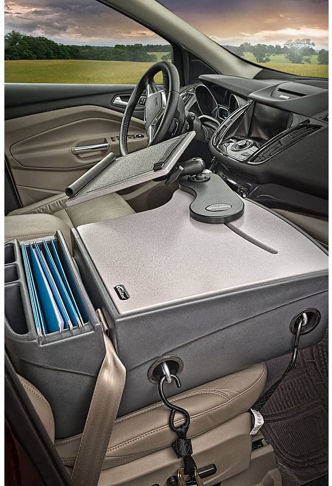 Slide out arm that extends the work tray another 23 in. from the edge of the desk. Tray with a non-slip pad, providing extra security so the laptop or tablet with keyboard wont move around while working. Additional security strap for a laptop or a tablet with a built-in keyboard. Keep all of your valuables safe with the hidden storage space located beneath the desk work surface.