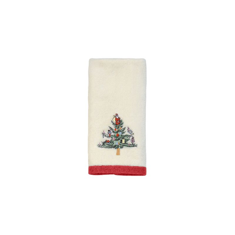 The new Spode Christmas Tree Embroidered Fingertip Towel features the intricately detailed iconic Christmas Tree and woven coordinating red border. Imported.