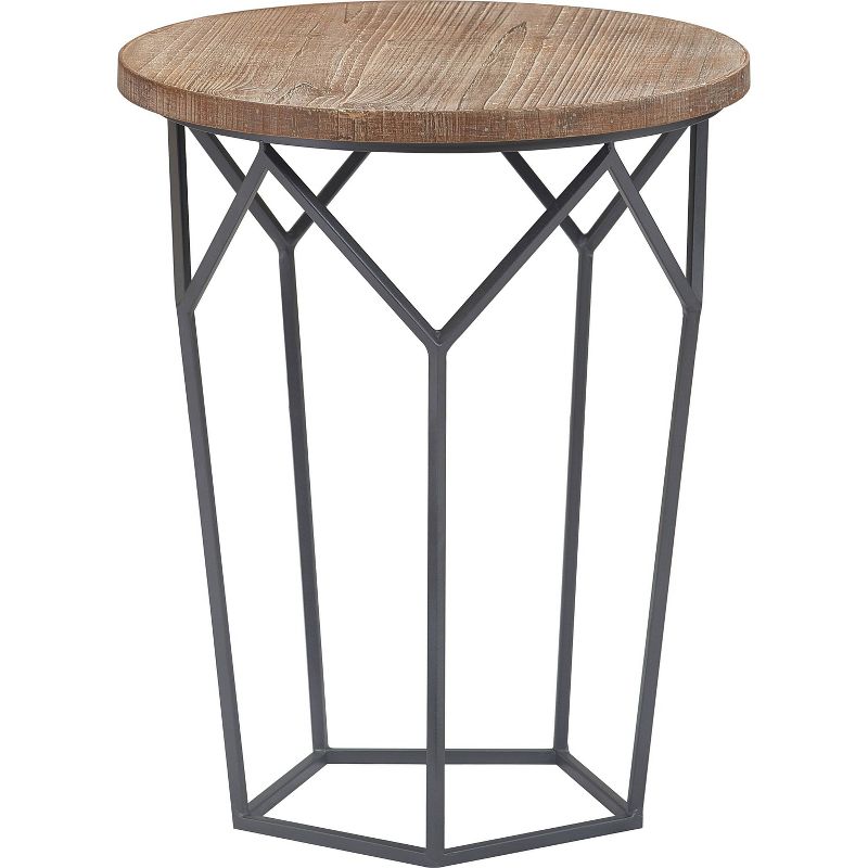 Show you’re in the know of today’s home trends with this modern geometric round side table by Finch. With a nicely wood-grained tabletop and contemporary metal base, this end table combines the popular looks of rustic and industrial to create one statement-making piece of furniture. The black pentagon base extends up to additional angles that hold the solid wood top strongly in place. Let this table anchor your living room decor with its open concept and geometric flair. Style it with rattan coasters and a cactus for a look straight out of a magazine. Due to the natural materials of the wood tabletop, unique variations are to be expected and celebrated.