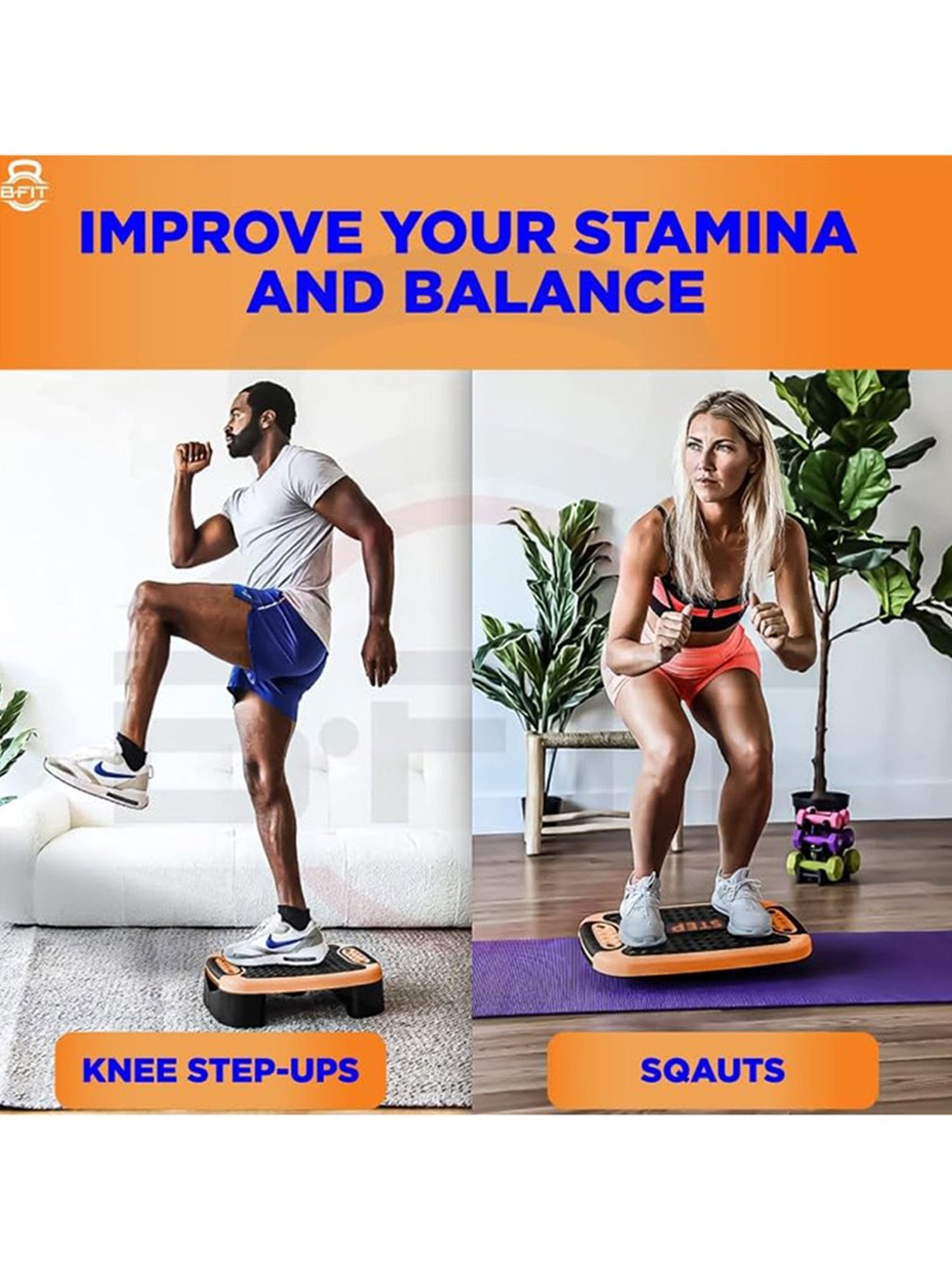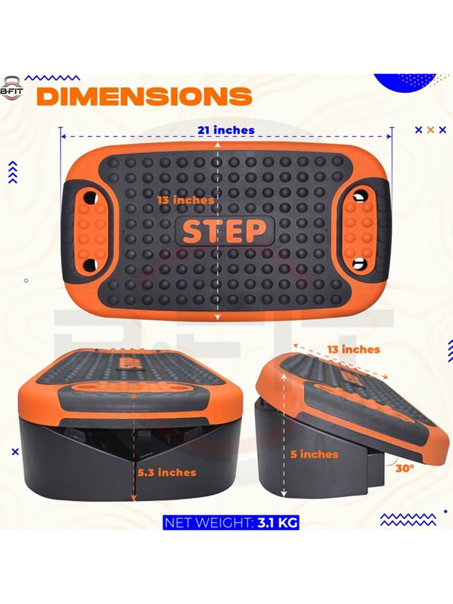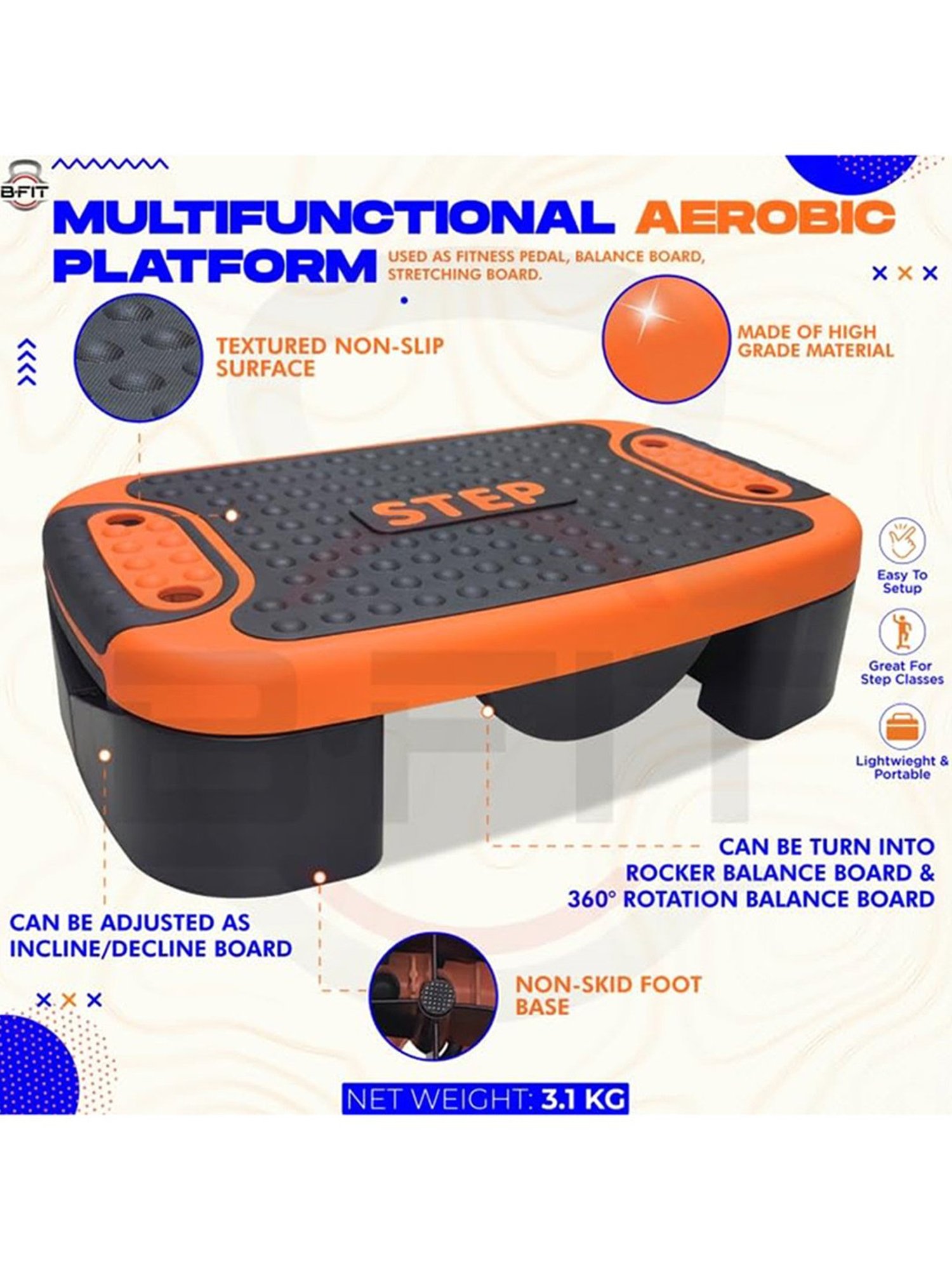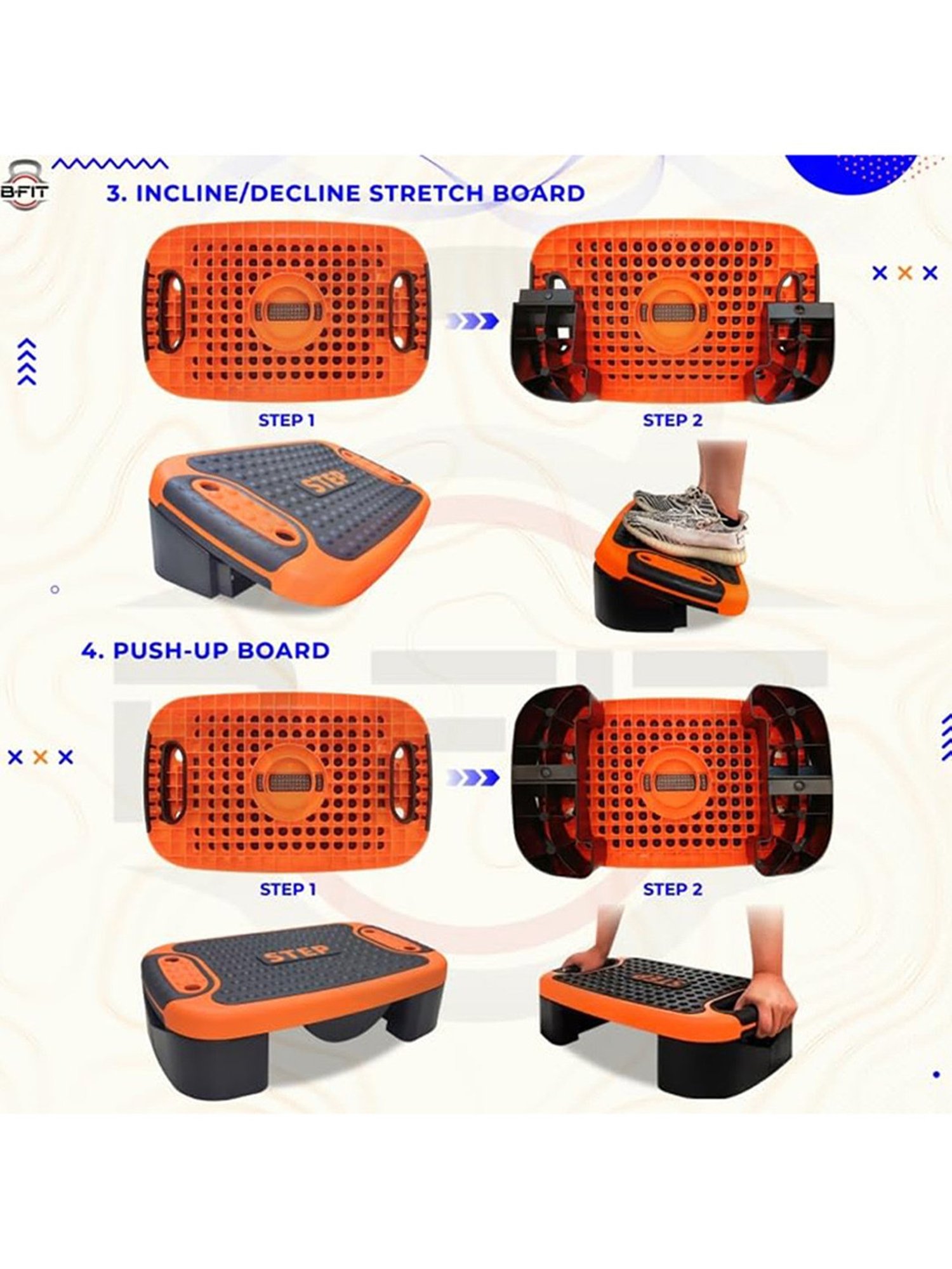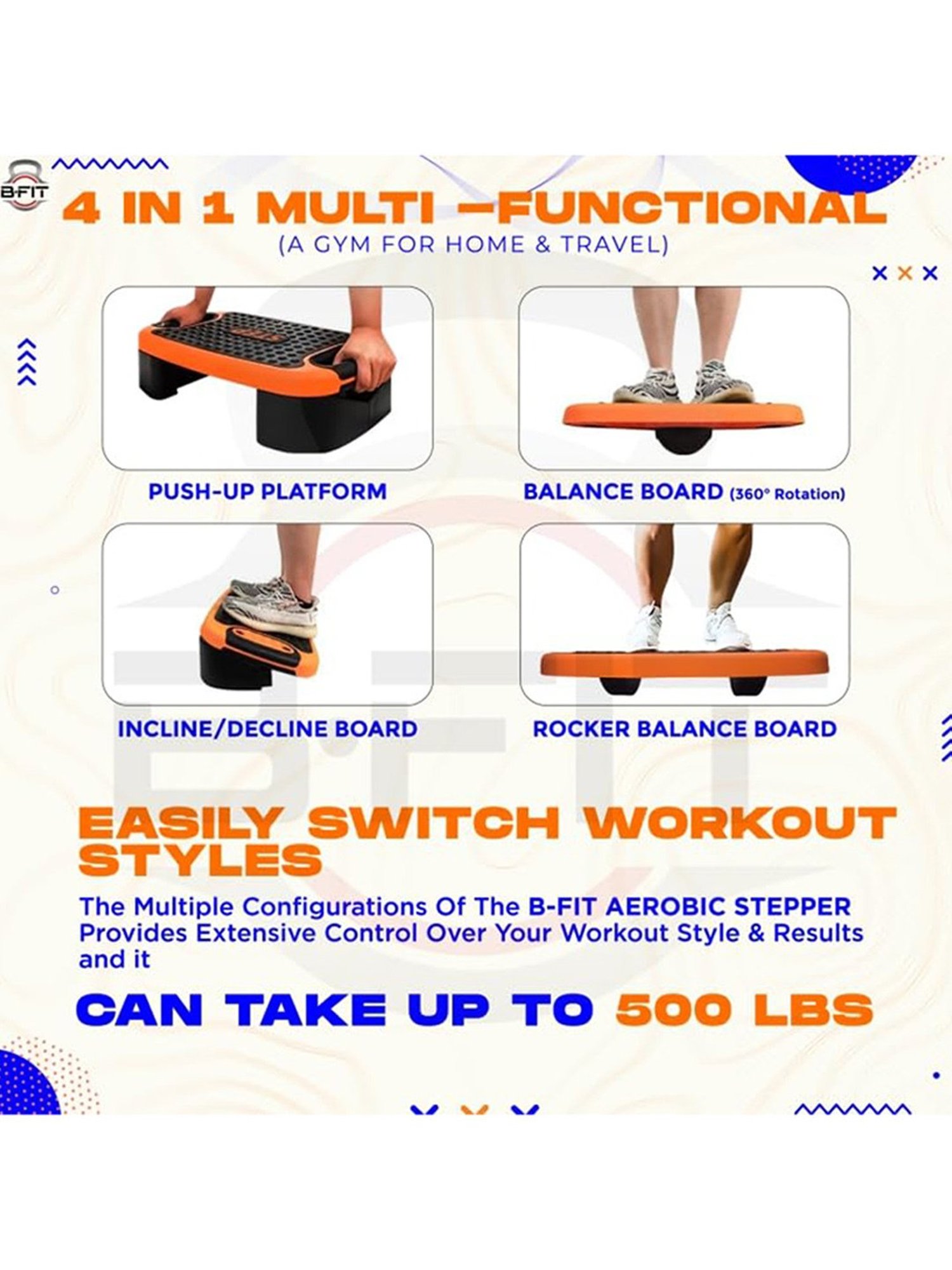 This black 4-in-1 aerobic step platform from B Fit offers 4 workout configurations for stretching, strength training, balance and aerobic exercises. Achieve ultimate control over your sessions with this versatile exercise stepper. Develop core strength, stability and firm footing with this fitness step platform. Transform the step exercise platform into an incline stretch board and unleash a deeper level of stretching that's hard to achieve by other means. It is crafted from plastic. It has a length of 50 cm, breadth of 20 cm, height of 15 cm and weight of 3150 gm.