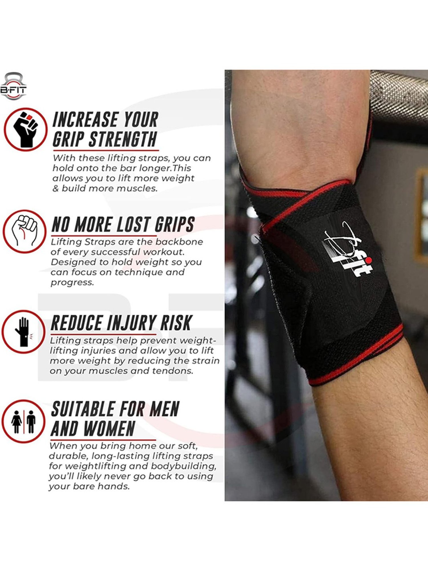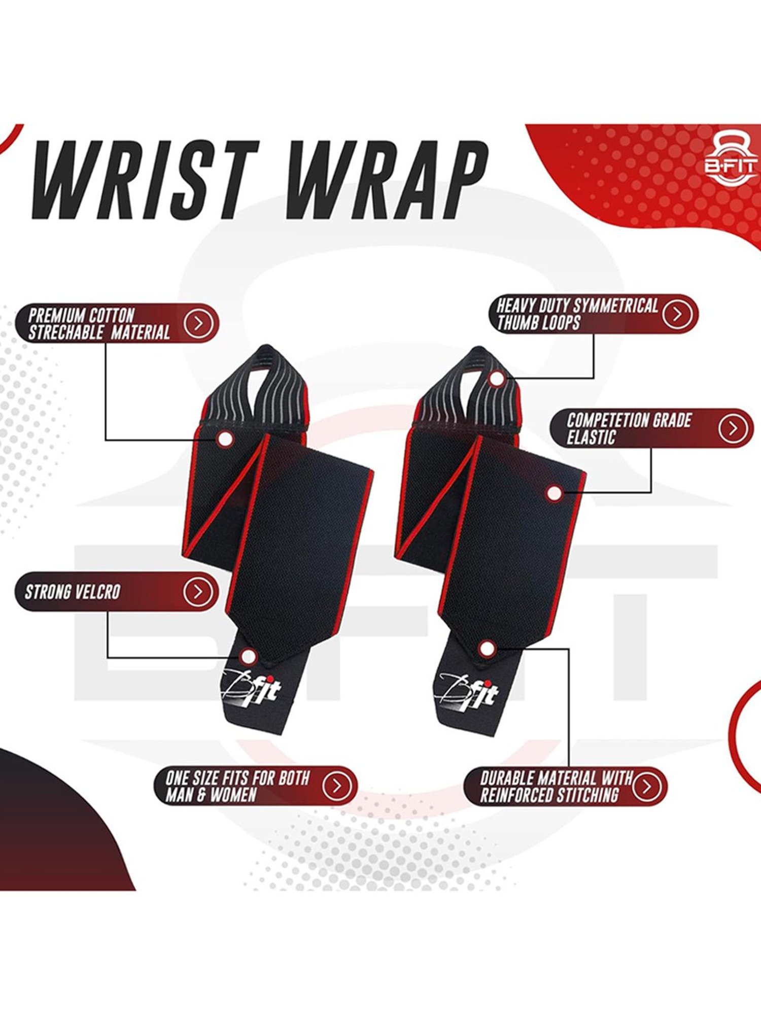 B FIT wrist wraps provide additional wrist support anytime you need it. These durable wrist wraps are made from a cotton, elastic, and polyester blend that absorbs excess moisture and won¿t irritate the skin. Use them for greater wrist stability anytime you are pressing or going overhead during weightlifting, powerlifting. Heavy Duty Wrist Wraps.