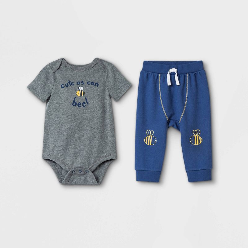 Bring some buzzin' cute style to his wardrobe with this 3-Piece Bee Top & Bottom Set from Cat & Jackâ„¢. This baby boys' three-piece clothing set includes a gray short-sleeve bodysuit with the text "Cute as Can Bee!", matching blue pants and a yellow hoodie, all with an illustration of bees for a charming look. Whether worn as a set or mixed and matched with other items, this bee hoodie set will bring all the cute vibes.